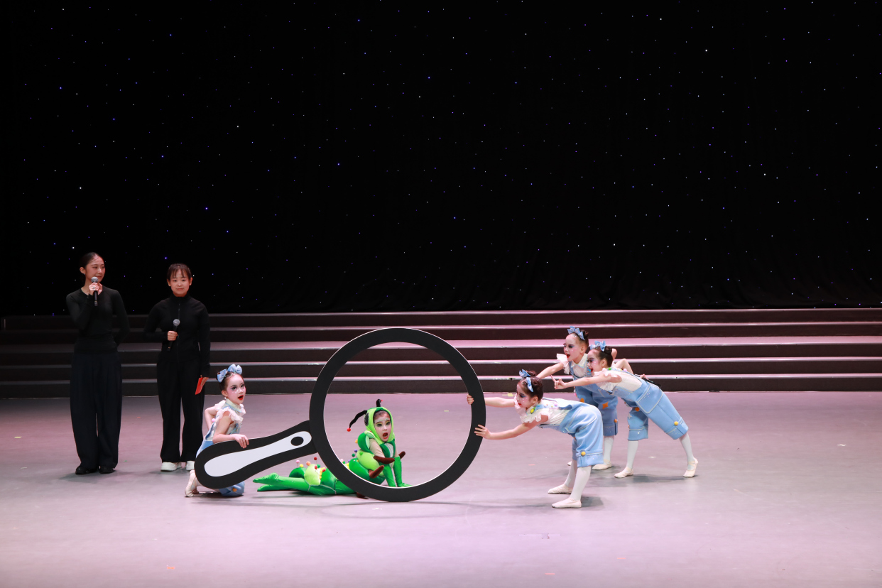 1月11日,丰台区少年宫青少年剧场内,一场别开生面的少儿艺术汇报演出正在进行。当欢快的《春天在哪里》旋律响起,登台的不只是小演员,还有他们的舞蹈老师。灯光下,老师一边引导孩子们演示“前后踢步”“侧踢步”等核心动作,一边向观众清晰讲解这些动作如何“生动还原孩童急切寻春的状态”。这不是彩排环节,而是正式演出的创新设计——舞蹈课堂的“教”与“学”,被创新性地、完整地搬上了聚光灯下的舞台。
