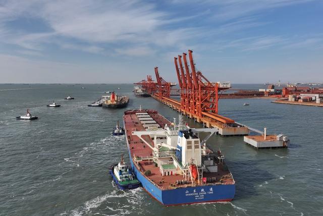 ↑1月13日,一艘轮船在拖轮协助下向唐山港曹妃甸港区矿石码头靠泊(无人机照片)。