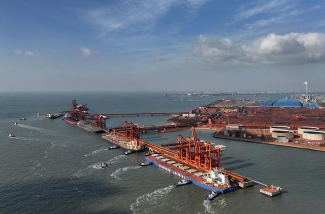 ↑1月13日,靠泊在唐山港曹妃甸港区矿石码头的一艘轮船在卸载(无人机照片)。