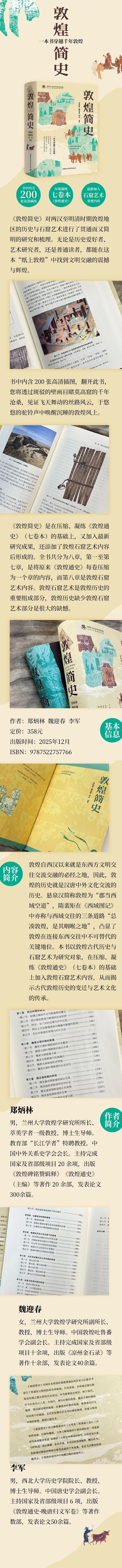《敦煌简史》是国家社科基金冷门绝学研究专项学术团队项目“敦煌河西碑铭与河西史研究”(项目编号:21VJXT002)阶段成果,也是中国历史研究院“绝学”学科扶持计划资助(项目编号:25JX004)项目,其出版得到教育部人文社会科学重点研究基地兰州大学敦煌学研究所、西北大学郑炳林名家工作室经费资助。