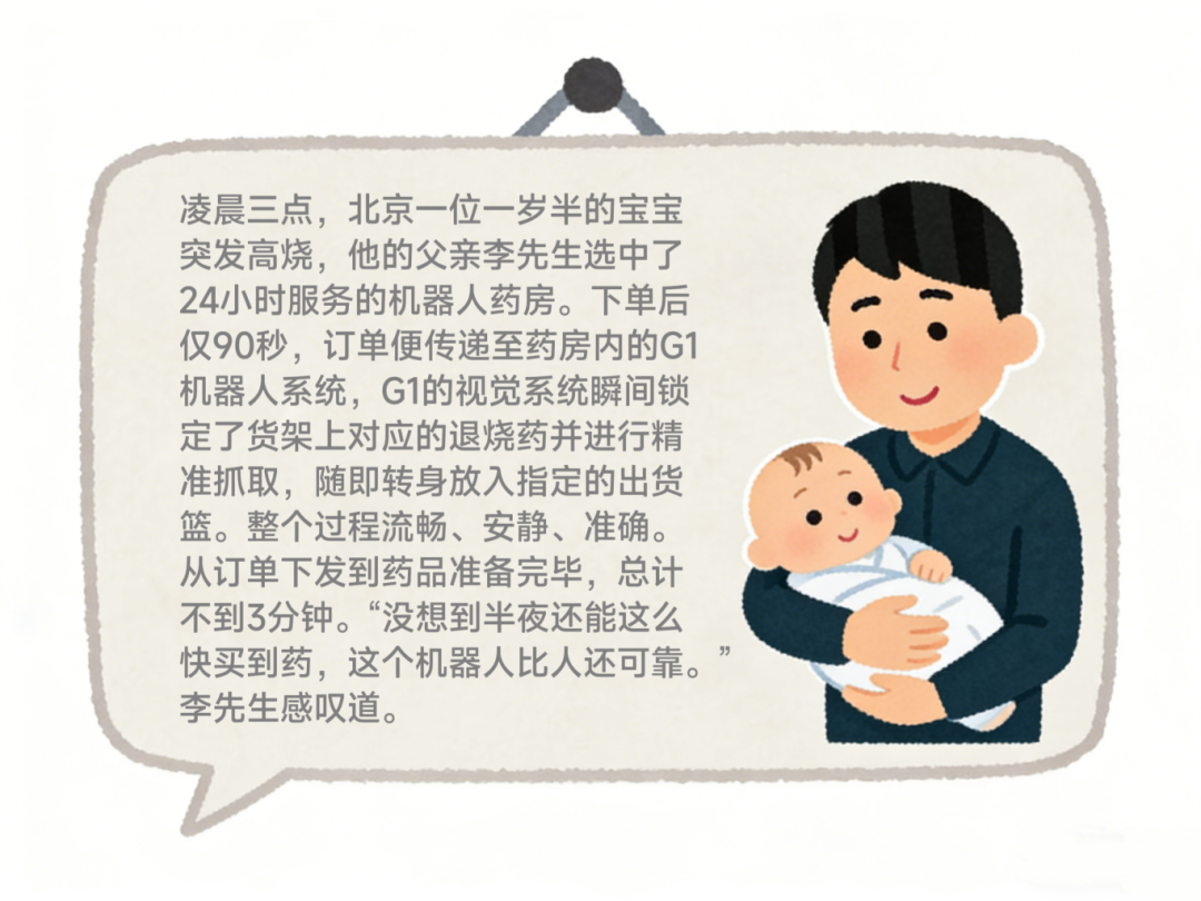 将传统药房的配药时间从分钟级缩短至秒级,实现24小时无间断服务,有效破解了夜间急用药、慢性病续方等“最后一公里”即时需求难题。