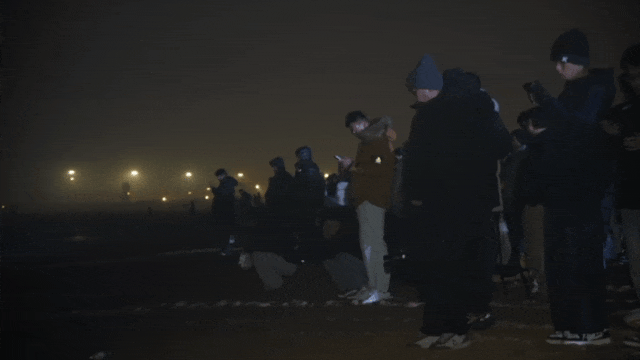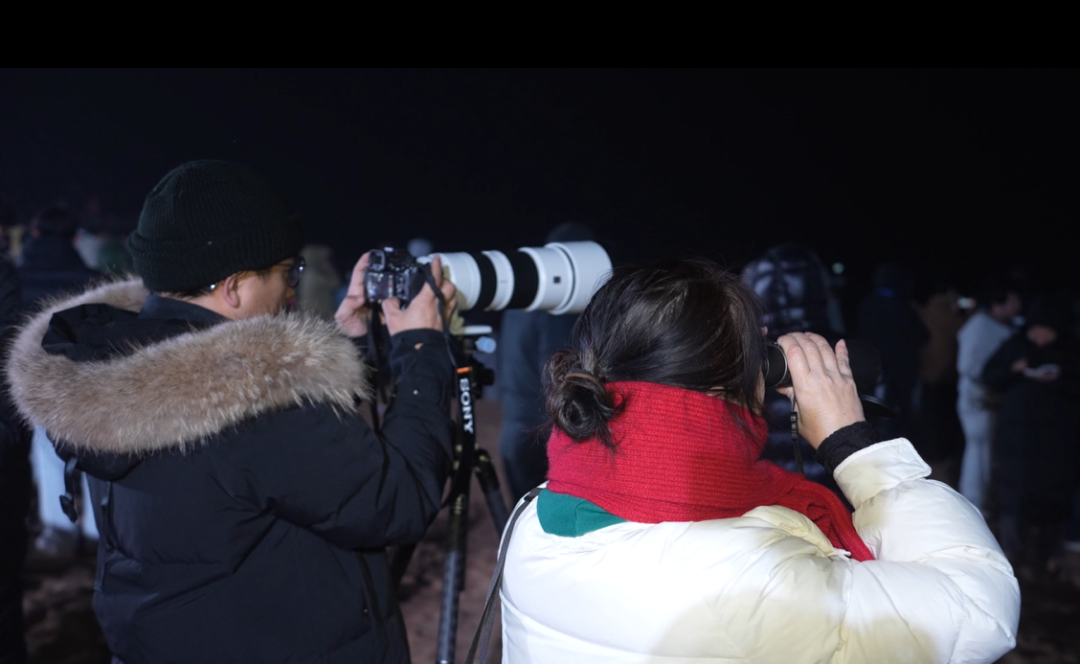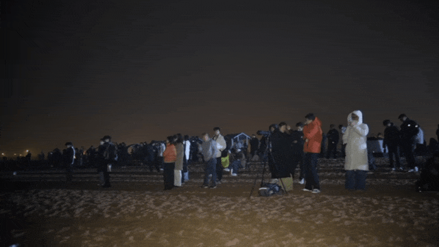 夜色中,观测区内的人气却愈发浓厚,脚步声、相机快门的调试声、低声的交谈声,在静谧的海畔交织成独特的序曲。专业摄影爱好者们早早选好最佳机位,三脚架稳稳固定,镜头反复校准对准发射架,只为捕捉火箭腾空的每一个精彩帧;不少游客举着手机,屏幕亮光照亮一张张期待的脸庞,有人不时刷新时间,有人互相叮嘱“发射时记得稳住镜头”;还有家庭结伴而来,以海上卫星发射背景板为依托,定格下这场特殊的凌晨之约。