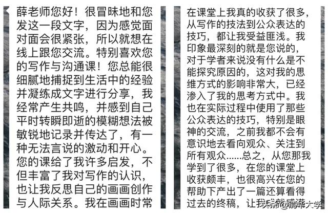 “好的课堂不仅是知识传递,更要触动情感的体验。”在薛亘华的课堂上,提问与回应交织,观点与思考碰撞,形成了多轮“情绪体验”。有同学在期末陈述信中写道:“我开始尝试从多角度来审视问题,而不是将复杂的问题简单地归结为单一的选择或答案。”这种思维的蜕变,不仅体现在学生的文字里,更渗透到他们为人处世的点滴中。