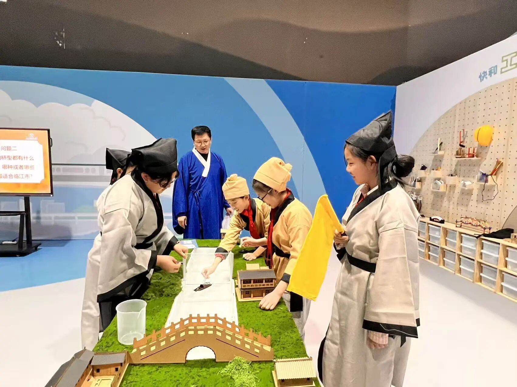 在“童心共筑中国桥”公益环节中,学生们分组协作、分工明确,精准完成测量、拼接、数据记录等任务,在默契配合中筑牢模型。这一环节不仅锻炼了学生的动手与问题解决能力,更让大家体悟到团队协作的重要性,涵养社会责任感与公益情怀。现场,学生们还沉浸式还原“万宁桥下的水上电梯”场景,通过扮演闸关、船夫等角色,感受古代桥梁工程智慧,领会古人因地制宜解决交通难题的创新思维。