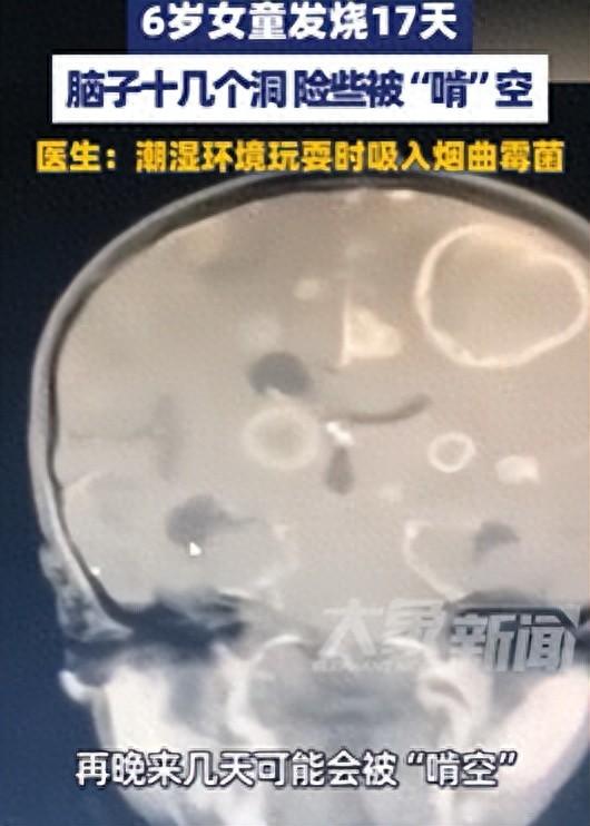 1月15日都市报道消息,河南一6岁女童发烧17天,意识不清转至郑州治疗。医生检查后大吃一惊!孩子脑子竟被“啃”出大大小小十几个洞,再晚来几天可能会被“啃空”!抽取洞内积液检测后,医生找到了“真凶”——烟曲霉菌。