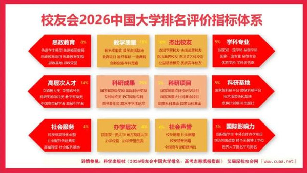 校友会中国大学排名首发于2003年,至今已有24年的历史,已成为具有广泛社会影响力、公信力、参考价值与创新力的中国大学排名领先品牌。校友会2026中国大学排名评价指标体系由办学层次、思政教育、教学质量、高层次人才、杰出校友、学科专业、科研基地、科研项目、科研成果、社会服务、社会声誉和国际影响力等12大一级指标组成。