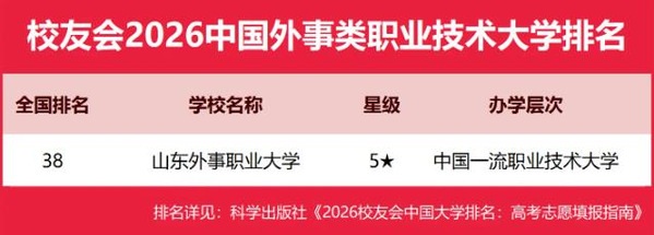 日前,全国第三方大学评价研究机构艾瑞深校友会网正式发布校友会2026中国外事类大学排名。山东外事职业大学凭借卓越的办学实力与综合影响力,在外事类职业技术大学细分榜单中脱颖而出,排名全国第一。这一殊荣不仅标志着学校在职业教育领域的外事标杆地位进一步巩固,更彰显了其在人才培养、国际化办学及社会服务等方面的突出成就。