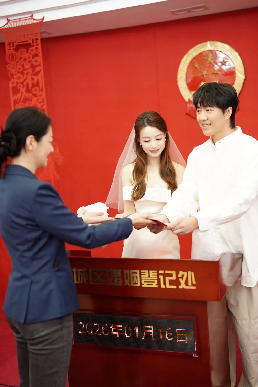 1月16日,导演陈孝良与湖南卫视主持人蒋林伶,这对恋爱综艺的“蒋孝话CP”在西城区婚姻登记服务中心完成结婚登记。