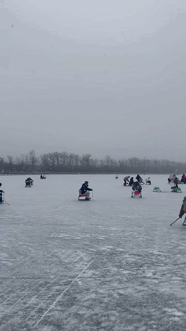 色彩明快的冰车与冰上自行车往来穿梭
