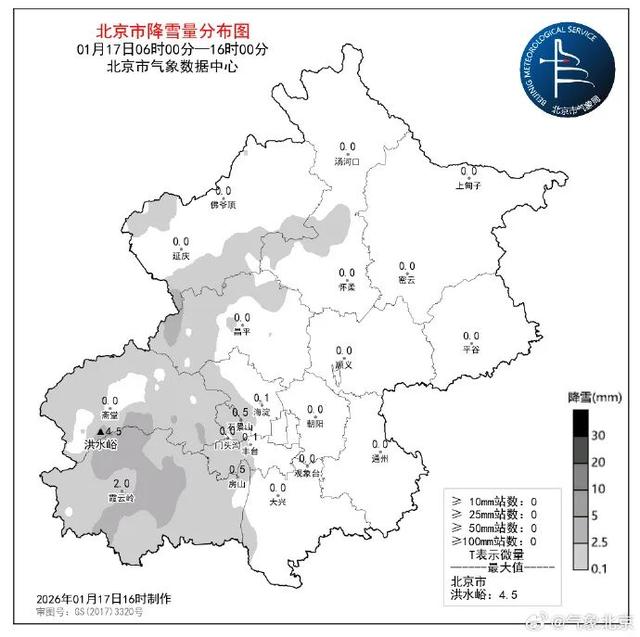 据气象北京,截至今天16时,全市平均降雪量0.3毫米,最大降雪量在门头沟区洪水峪4.5毫米。最近1小时(15-16时)最大小时降雪量也出现在该站,0.7毫米。