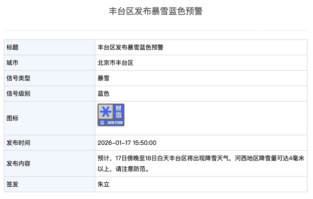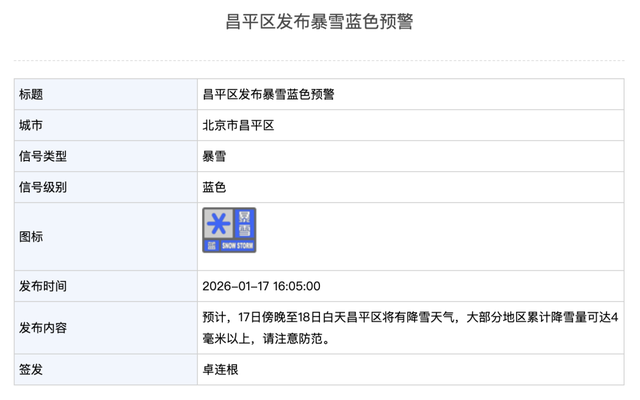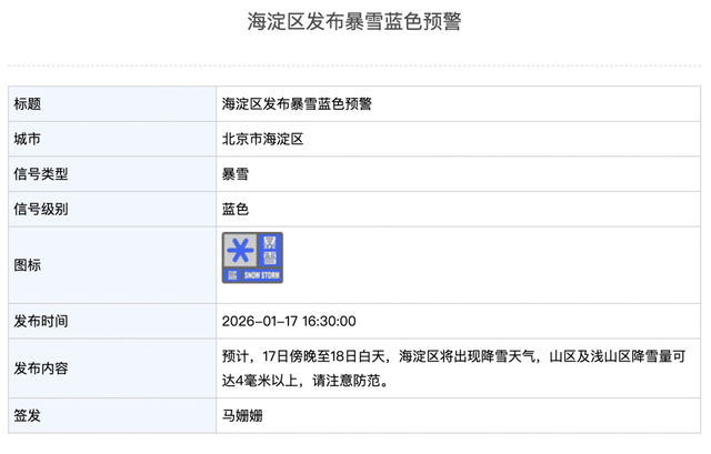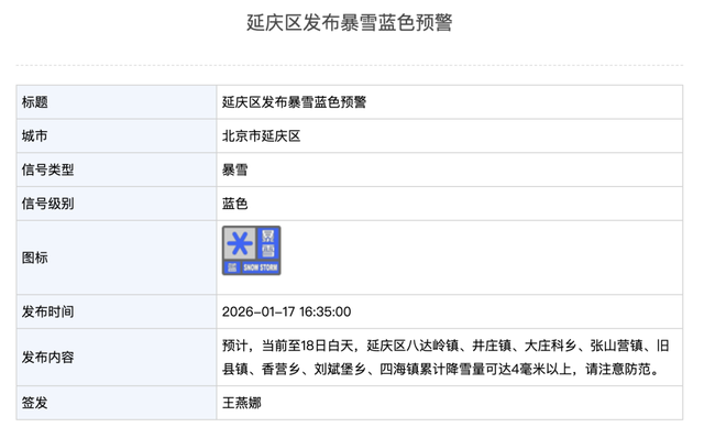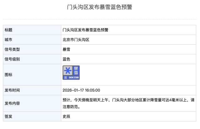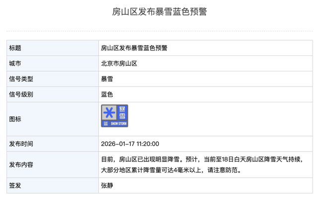 目前,石景山区、门头沟区、昌平区、丰台区、房山区、海淀区、延庆区气象台发布暴雪蓝色预警信号。