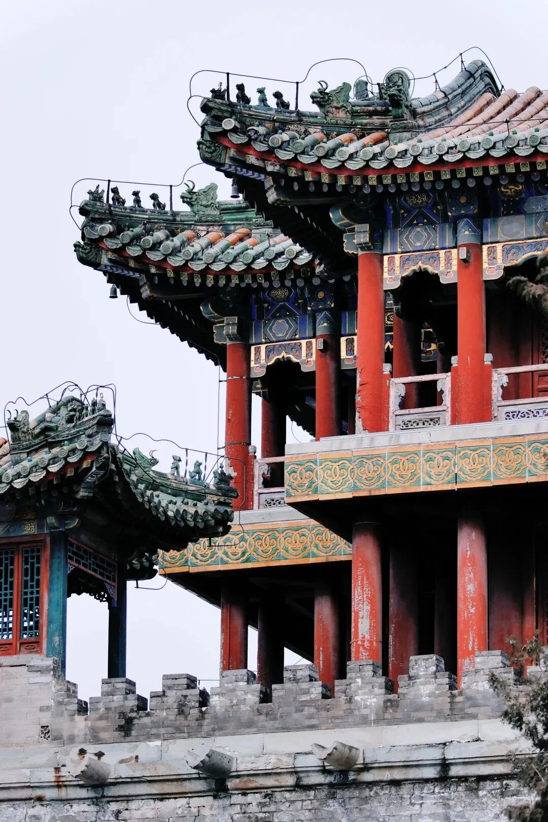蜿蜒的长廊裹上了蓬松的雪绒边,梁枋间的彩绘在白雪映衬下,反倒愈发鲜亮明艳。