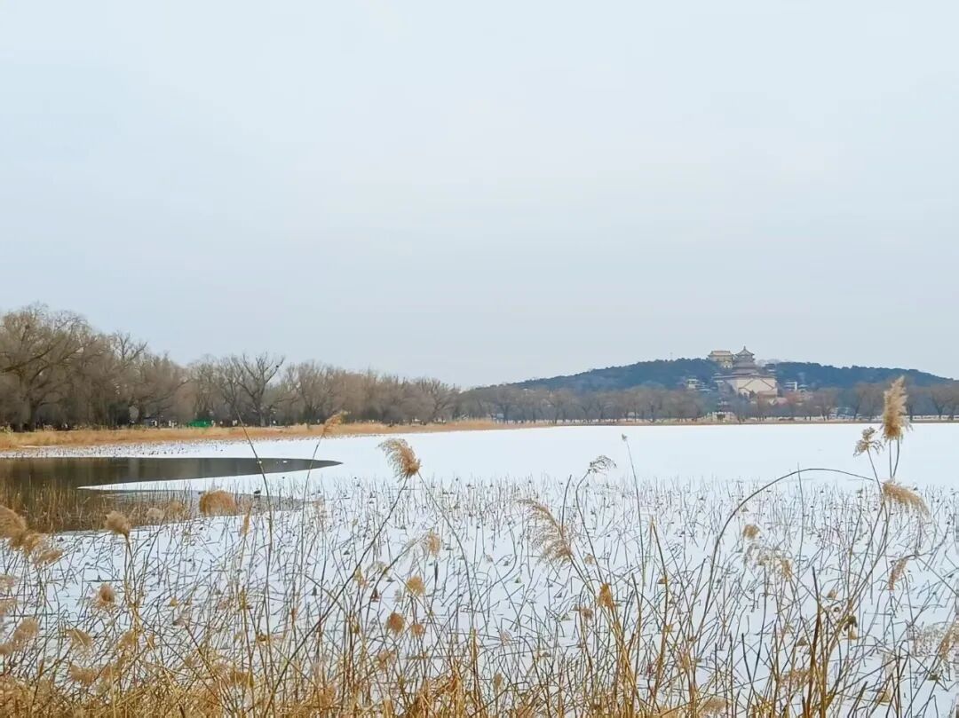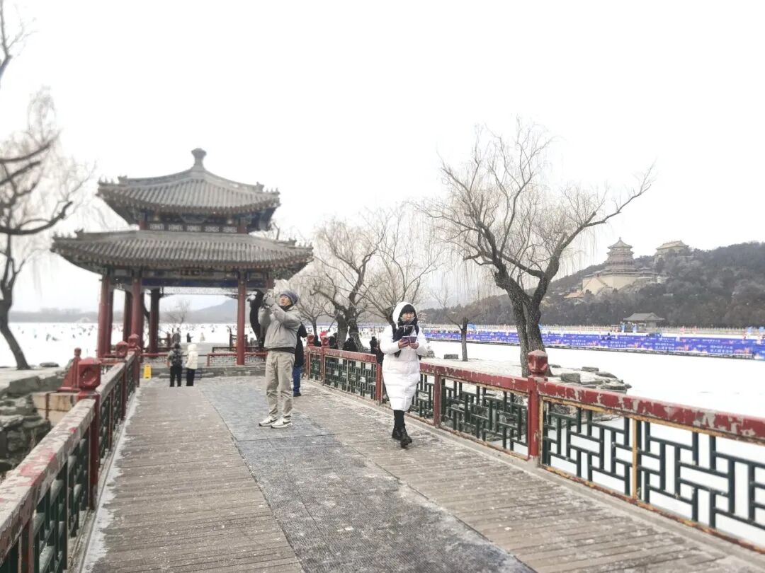 此刻的颐和园,正被雪花慢慢染成一幅素雅的水墨画。万寿山上,佛香阁身披素雪傲然伫立,朱红宫墙、鎏金瓦顶与皑皑白雪相映,宁静而庄严。