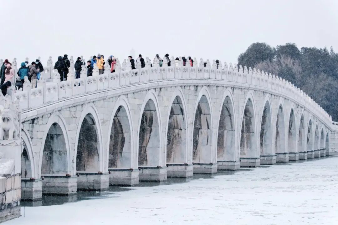 十七孔桥直接化身“银装长龙”,桥上544只石狮子仿佛戴上了毛茸茸的“雪绒帽”,憨态可掬。