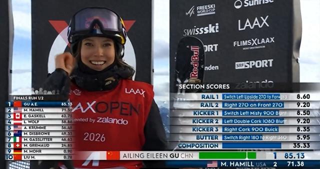 北京时间1月17日晚,2025-26赛季自由式滑雪世界杯瑞士莱克斯站女子坡面障碍技巧决赛,谷爱凌以85.13分获得冠军。这是她本赛季首个坡面障碍技巧的冠军,也是其个人的第20个世界杯冠军。另一名中国选手刘梦婷排名第十。