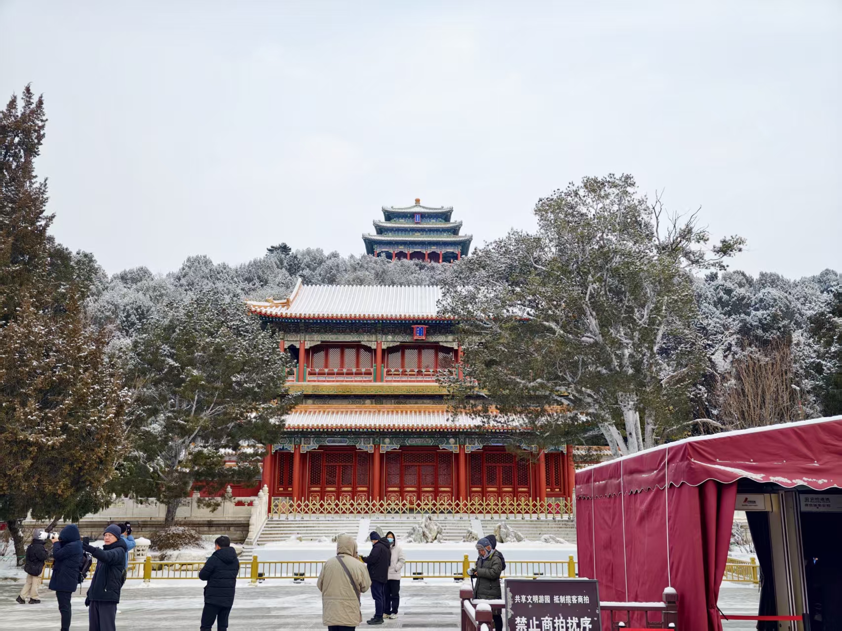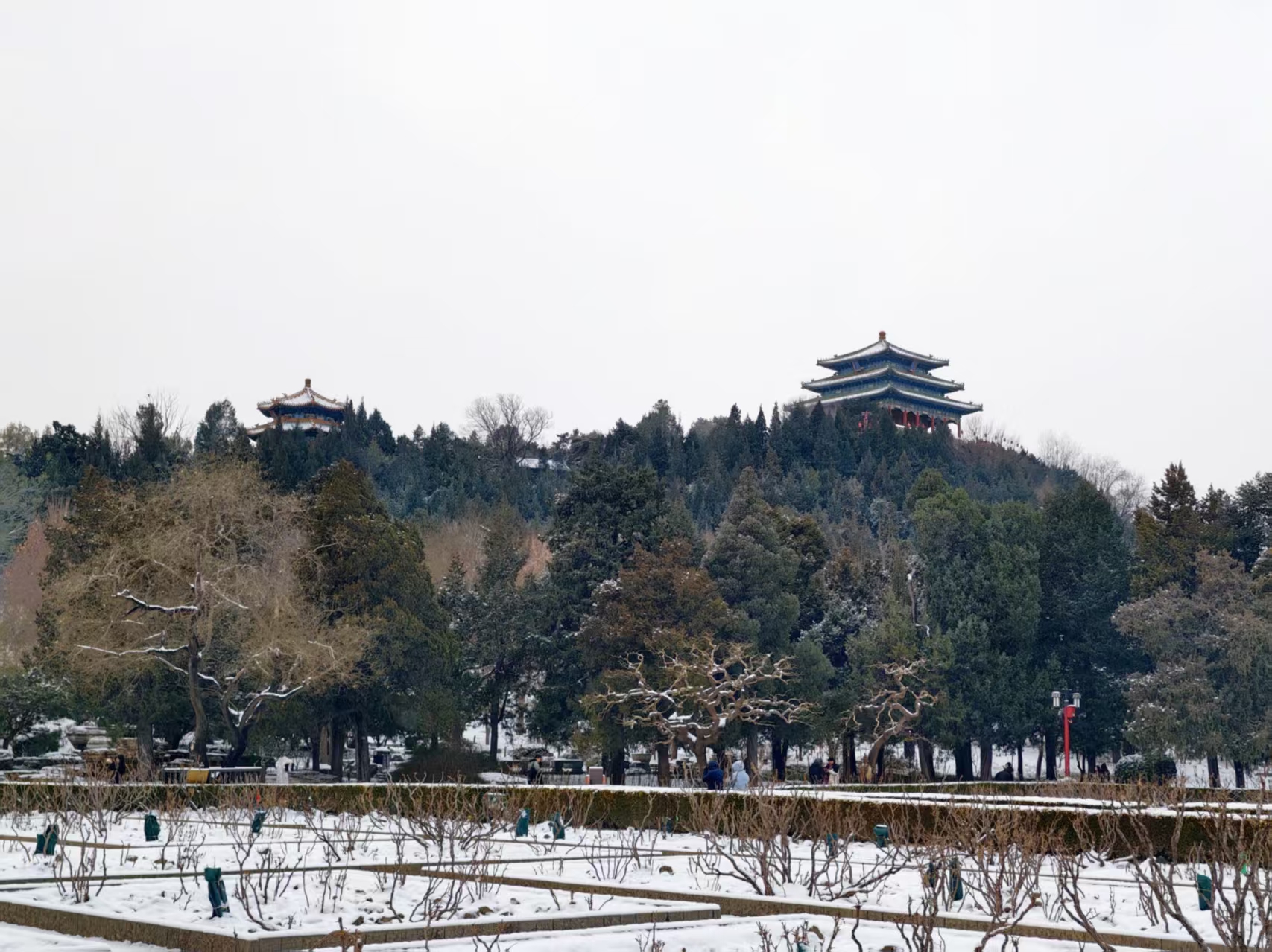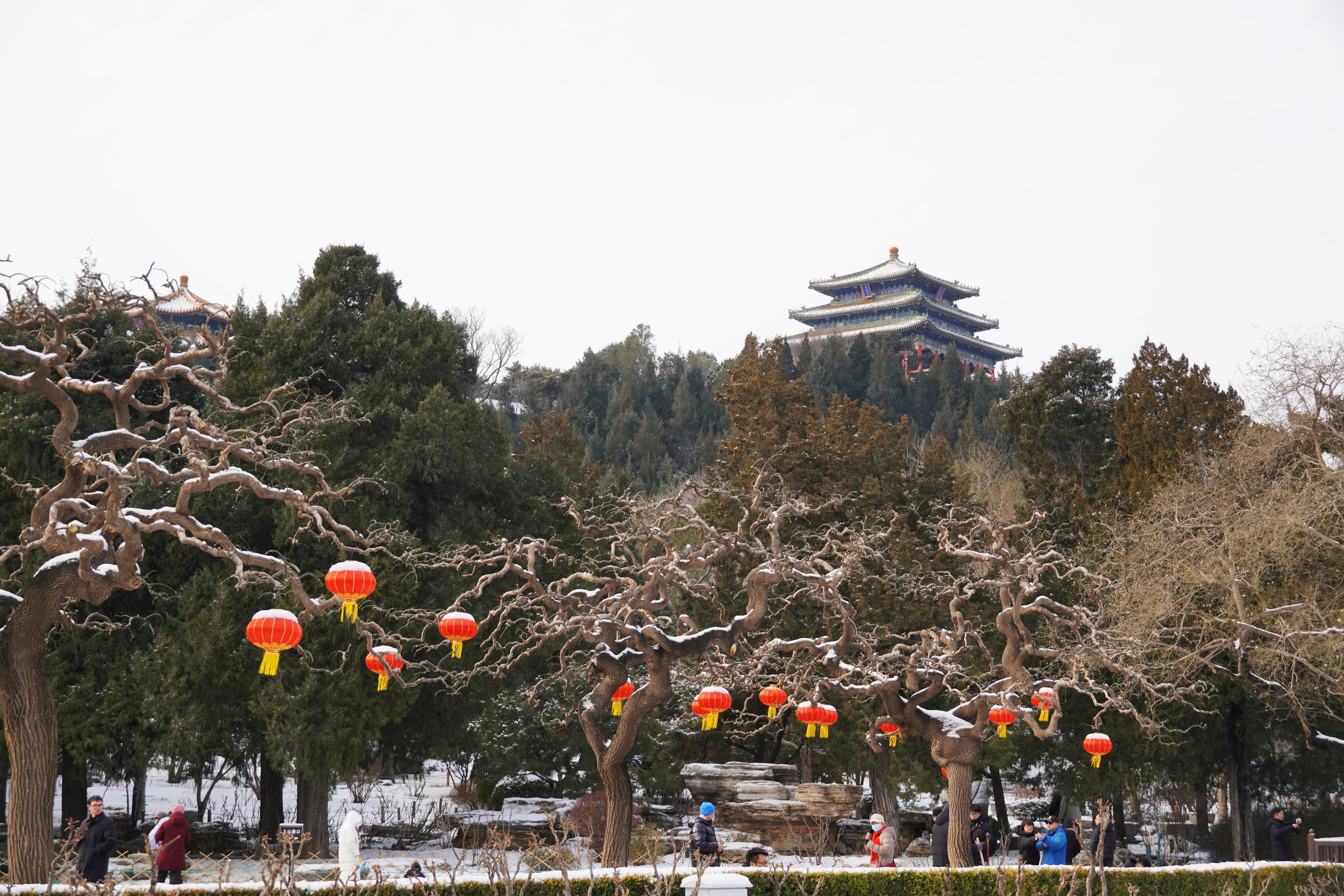 1月18日,雪后初晴。景山公园内,古槐、红灯、琉璃瓦,在白雪映衬下,古韵十足。万春亭下,市民登高远眺,故宫雪景尽收眼底。