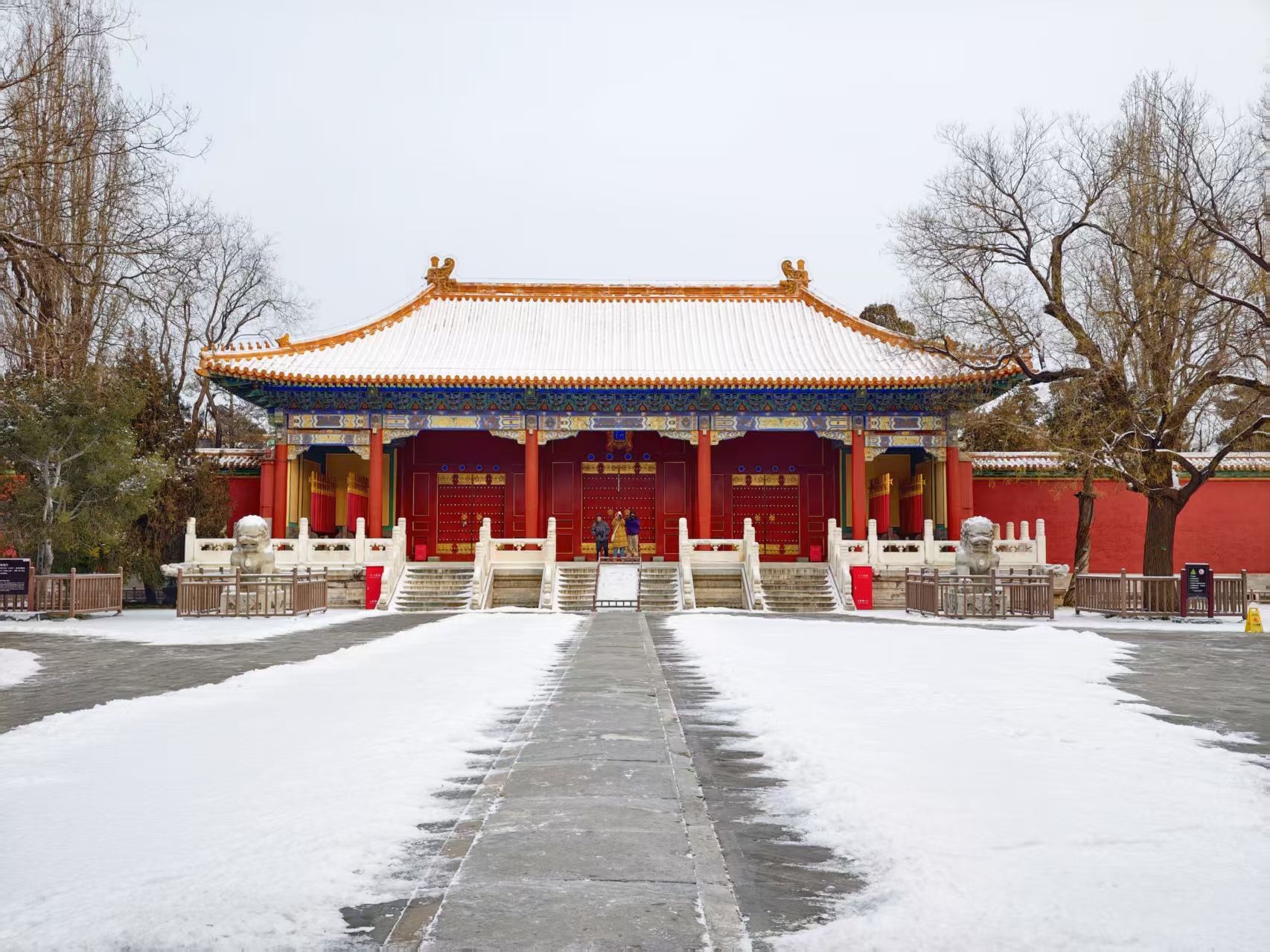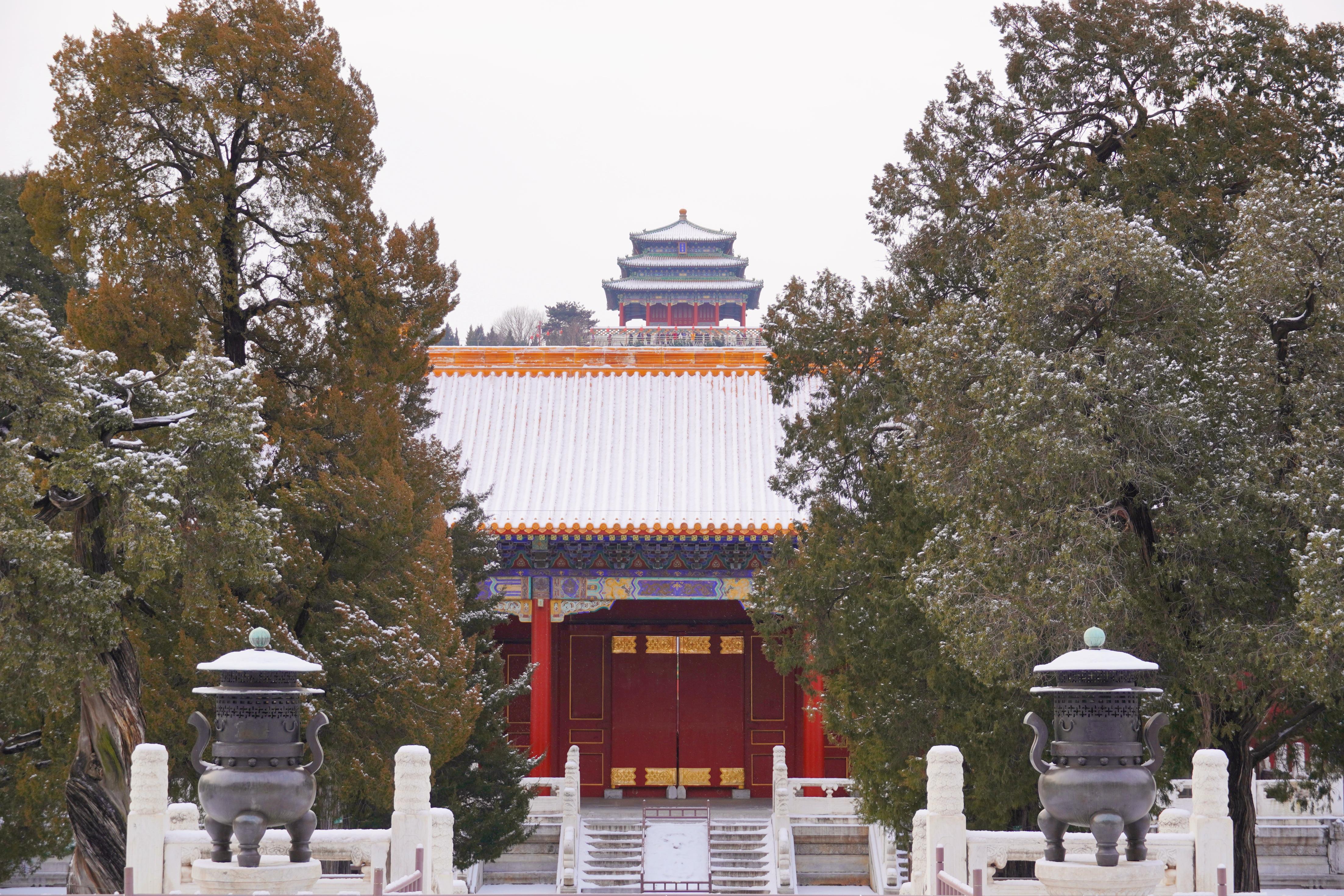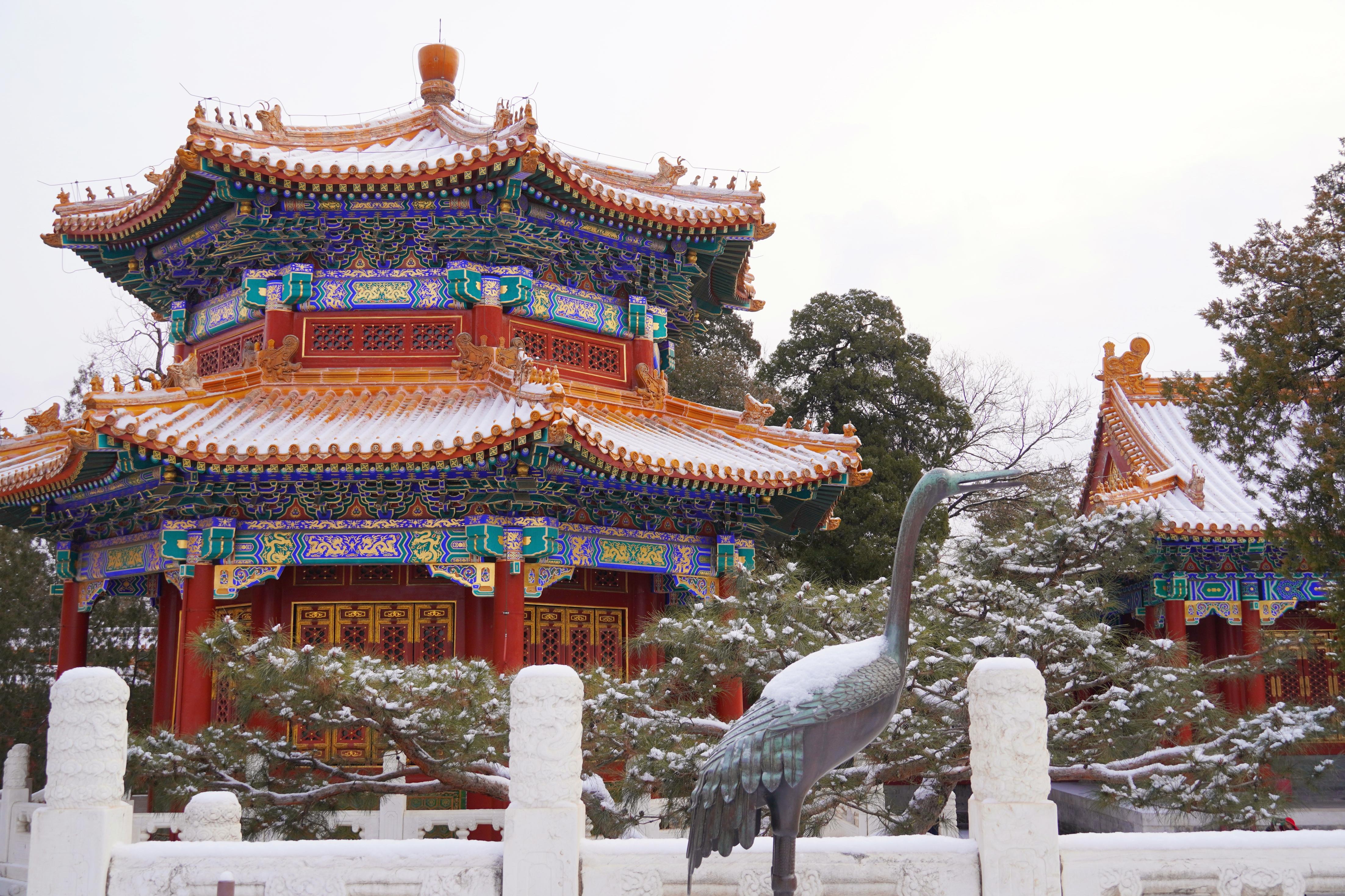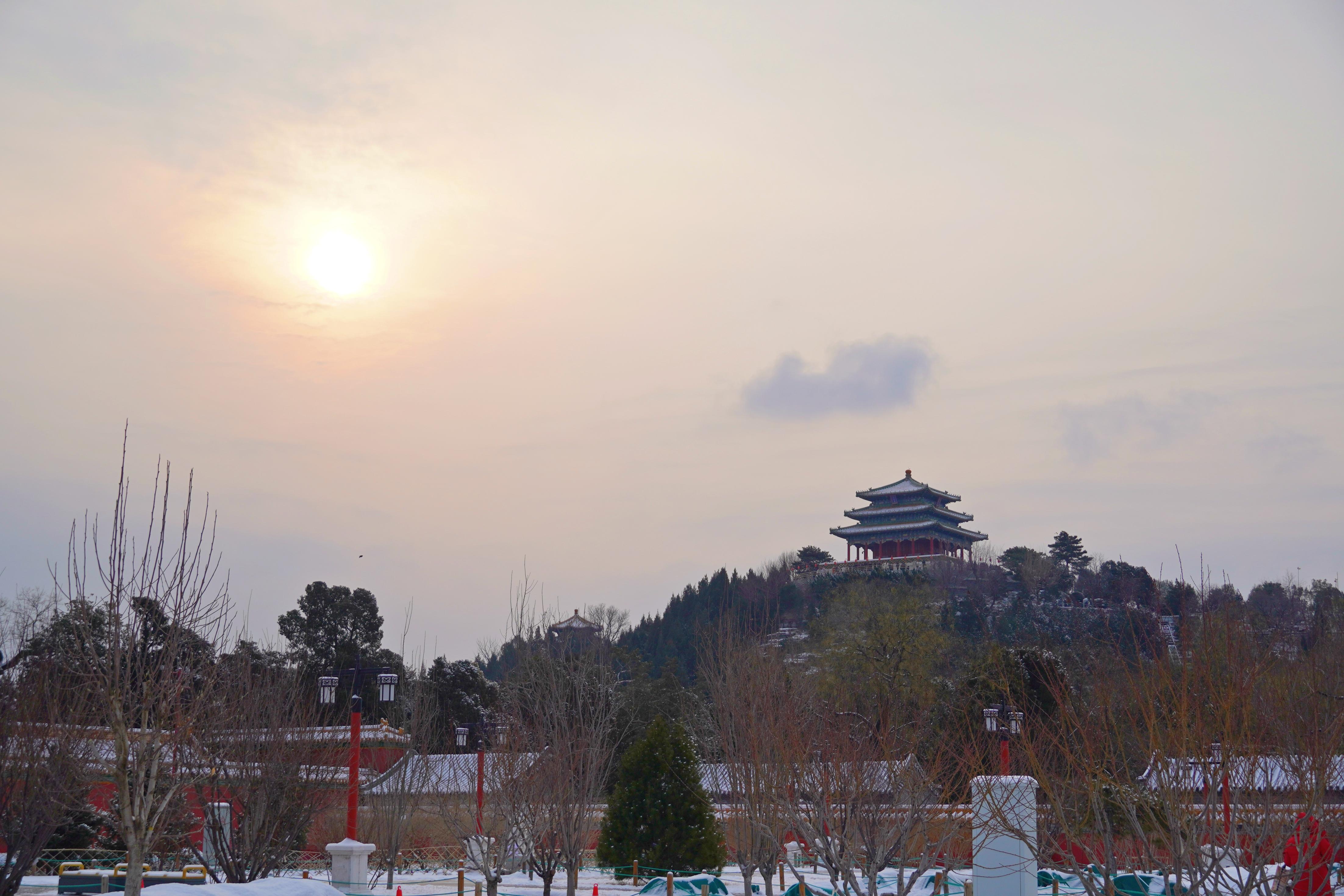 1月18日,雪后初晴。景山公园内,古槐、红灯、琉璃瓦,在白雪映衬下,古韵十足。万春亭下,市民登高远眺,故宫雪景尽收眼底。