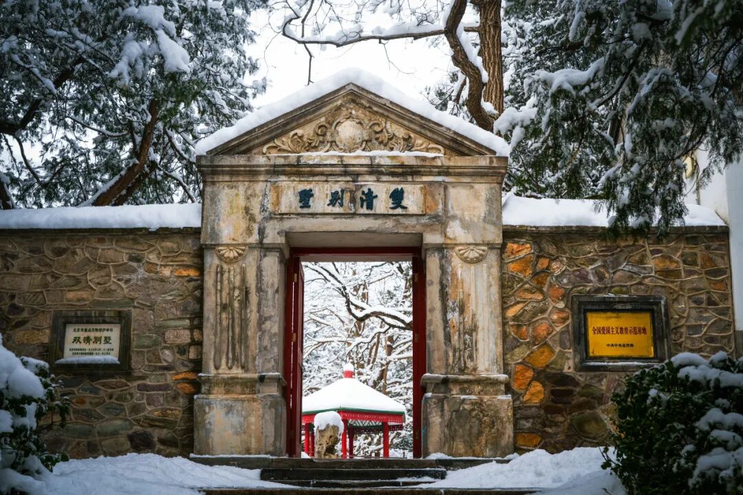 1949年3月25日,中共中央和中国人民解放军总部进驻香山,毛泽东同志入驻双清别墅,在这里,他指挥渡江战役,发出了“将革命进行到底”的号召,写下《论人民民主专政》,为建立新中国擘画蓝图。雪落时分,双清别墅银装素裹,白雪覆盖的枝头探入冰面,与红亭白房相映成景,一地碎玉铺就静美画卷,踏雪而行,脚下咯吱作响,似在与历史轻声对话。