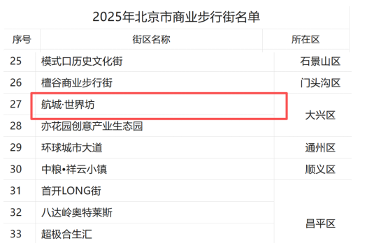 近日,由北京市商务局指导、北京特色街商会组织评估的2025年北京市商业步行街名单正式发布,由新航城公司投建的首个临空区商业项目“世界坊”成功入选。