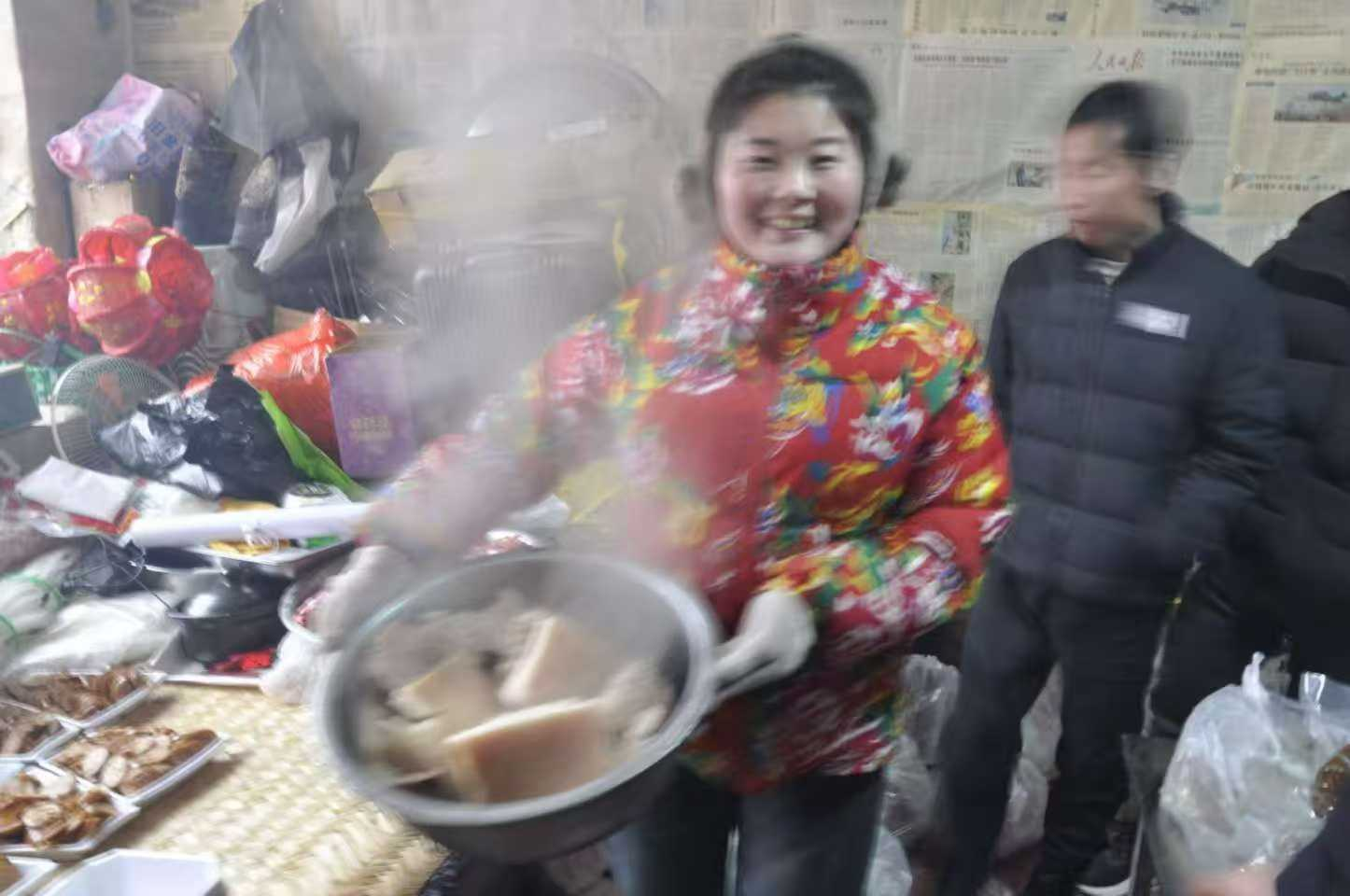 餐桌上摆满了地道的农家菜肴:特色的泡猪饭香气扑鼻,自家灌制的腊肠咸香可口,还有炖猪骨、血肠、酸菜粉条、最为显眼当属当地特色杀猪菜等八道家常菜。这些菜品没有精致的摆盘,却凝聚着最朴实的乡土味道与邻里厚谊。每一道菜都出自志愿者和乡亲们之手,用大铁锅柴火慢炖,味道醇厚,暖胃更暖心。席间,程林和楠楠向每一位到场的宾客表达感谢。程林感慨地说,是大家的支持与鼓励让他有了坚持下去的动力,这场宴席是他一点小小的心意,希望能让大家感受到家的温暖与过年的喜庆。简单的几句话,让现场很多人的眼眶湿润了。