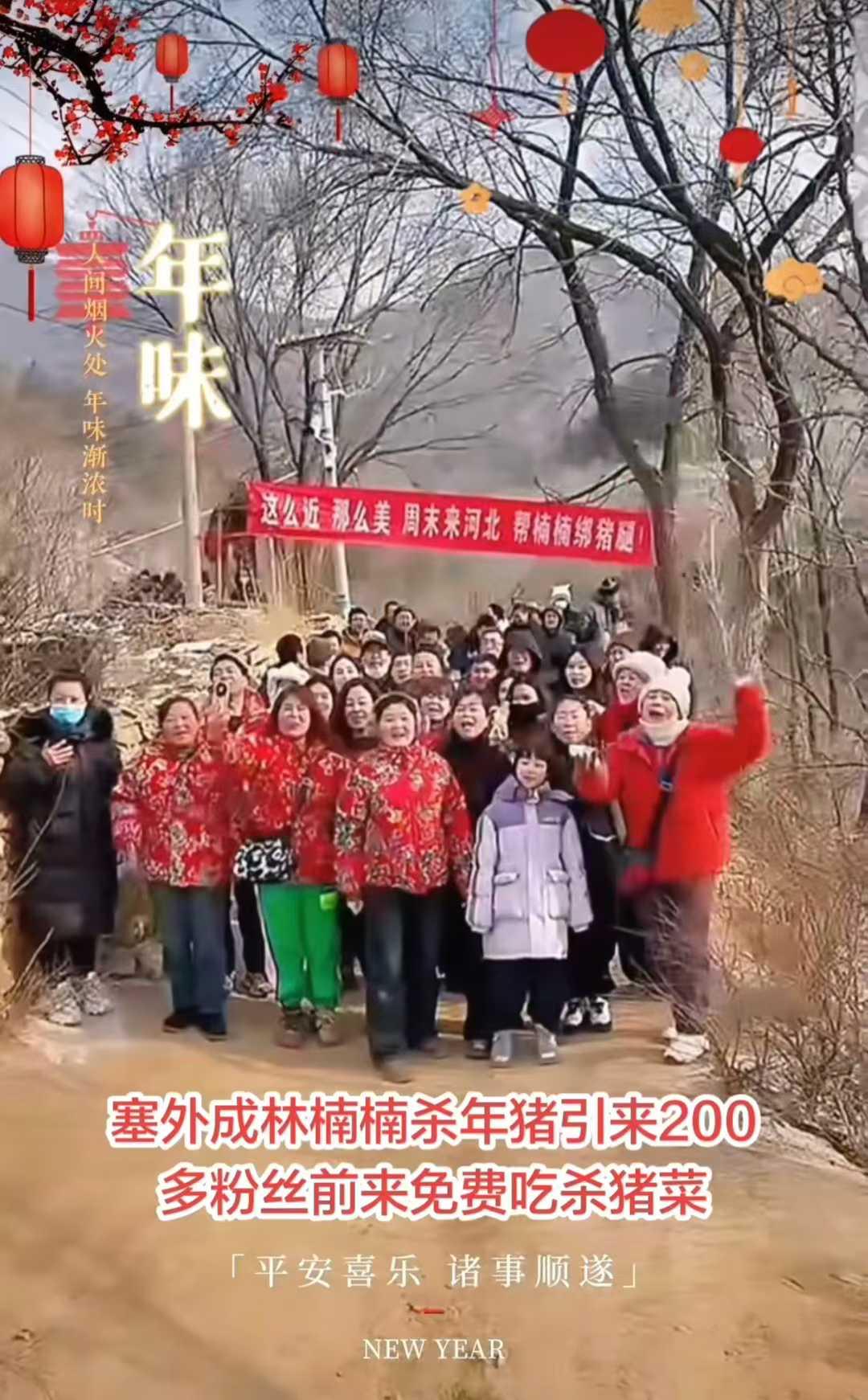 准备了三百多人的杀猪菜,确来了五百多人,这是河北隆化凤凰岭村一场别具温情的年猪宴民俗活动现场。这里地处塞外,严冬不但寒冷还下着小雪,但腊月的山村却被浓浓的烟火气与暖意包裹。2026年1月18日,在汤头沟镇的凤凰岭村,一场以答谢为主题的“啃猪宴”热闹开席。组织者是当地两位普通的村民——塞外程林与楠楠。程林是一位需要定期透析维持健康的农人,平日里靠销售农产品为生活,楠楠也是历经艰难最后不得直播维持,两个素不相识的人为了生存共同合作,尽管生活不易,他们却始终怀着一颗感恩之心。值此年关之际,他们决定用最淳朴的方式回馈一直支持他们的亲友、乡邻以及众多关注他们的网友。于是,一场充满乡土气息的年猪宴在笔架山下的小山沟庄里拉开了序幕。