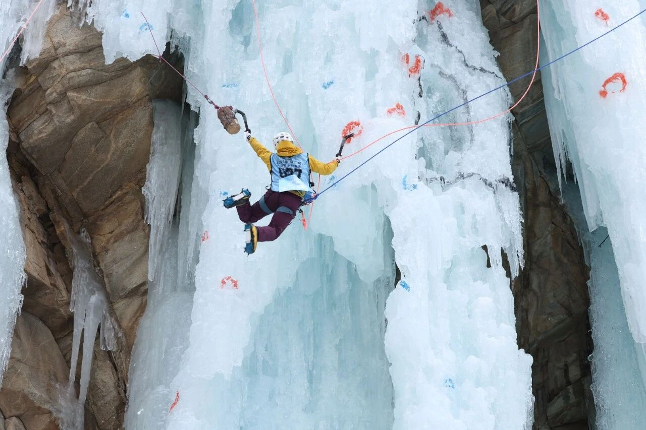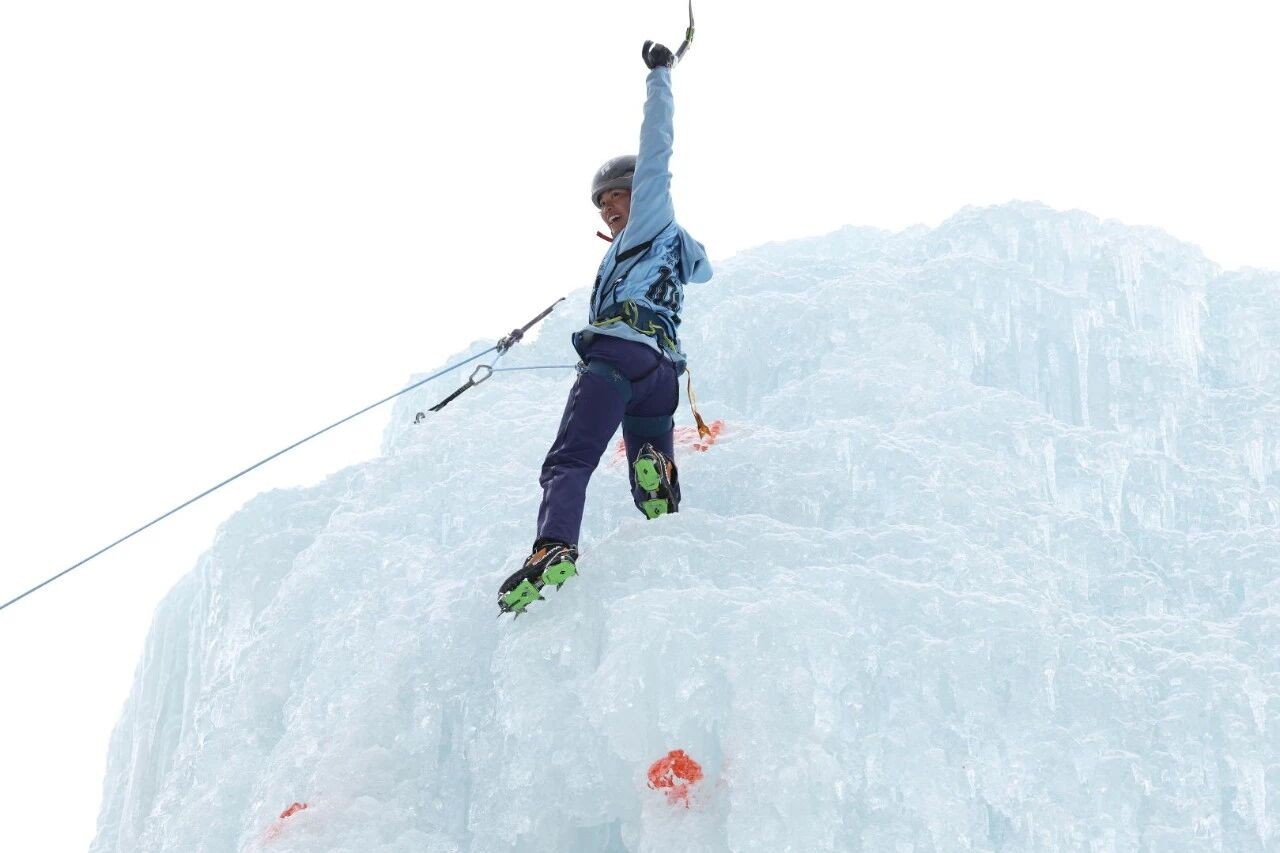 赛事专业性备受瞩目,国内首位亚洲金冰镐奖获得者、顶级攀登者周鹏担任技术总监及主定线员。他设计的赛道兼具挑战性与竞赛性,男子决赛线路难度达M11+,女子决赛线路难度为WI7,既考验选手的力量与耐力,更对技术精准度提出高要求,充分展现了攀冰运动的极限魅力。赛场上,选手们身着专业装备,挥镐踏冰、灵动攀升,在冰壁上展开激烈角逐,精彩表现赢得现场观众阵阵喝彩。