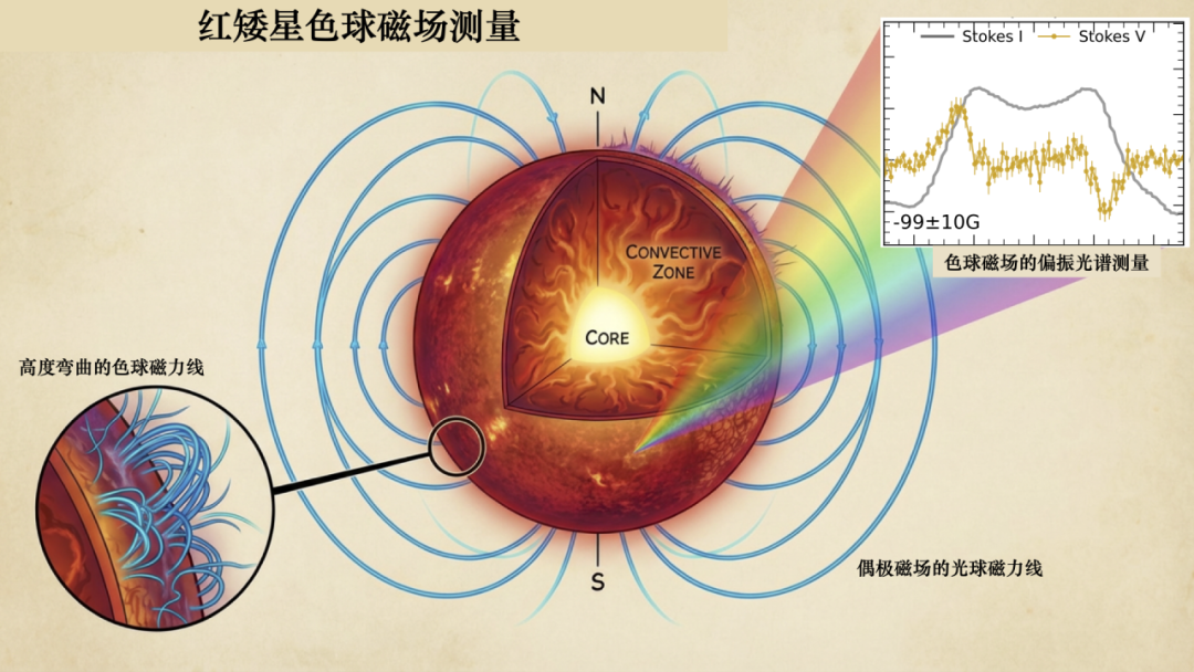 红矮星是银河系中数量最多的恒星,也是许多宜居带系外行星的“母星”。但红矮星通常比太阳更活跃、更容易爆发超级耀斑,这些爆发可能摧毁行星大气,对潜在生命形成威胁。因此,了解红矮星高层大气的磁场,是评估其行星宜居性的重要一环。然而,恒星色球层的磁场极其微弱、难以捕捉,人类此前从未获得过太阳之外的色球磁场测量。