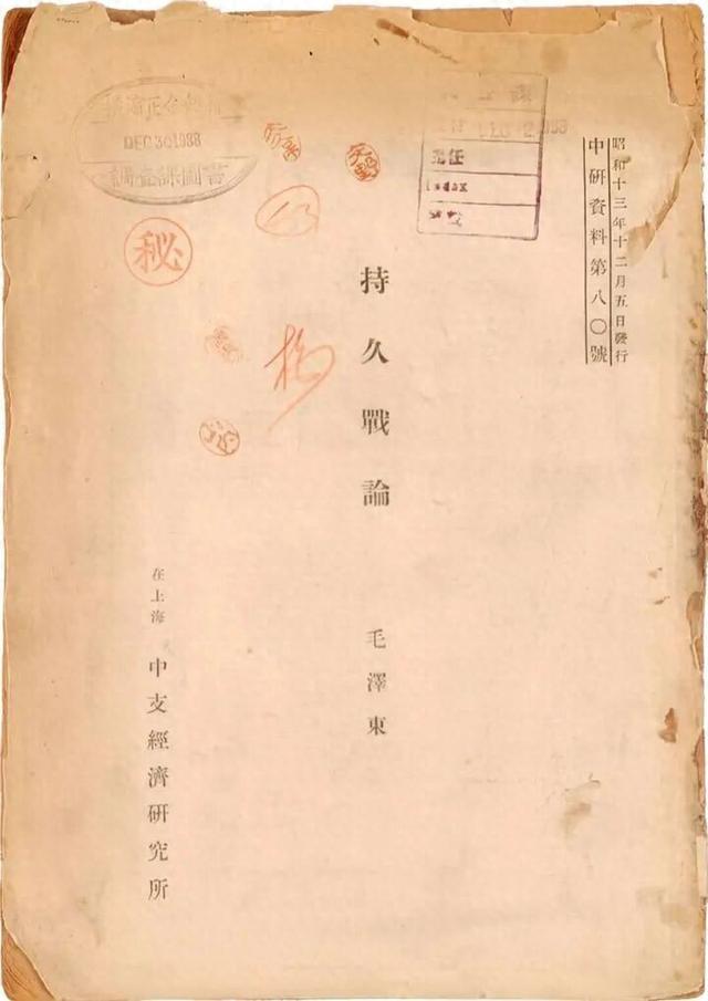 1938年12月,日本中支经济研究所翻译发行的《论持久战》日文译本(见上图),为中研资料第八〇号。封面盖有“秘”字红章,为当时日本收藏机构加盖,为保密资料。日本的情报和研究机构,将《论持久战》翻译成日文,可能是供日军军政高层、情报人员等阅读研判,用于内部研究中国共产党对抗日战争的作战指导思想。此版本见证了中国共产党领导的抗日根据地军民对日本的顽强抵抗,已引起日本的高度重视。