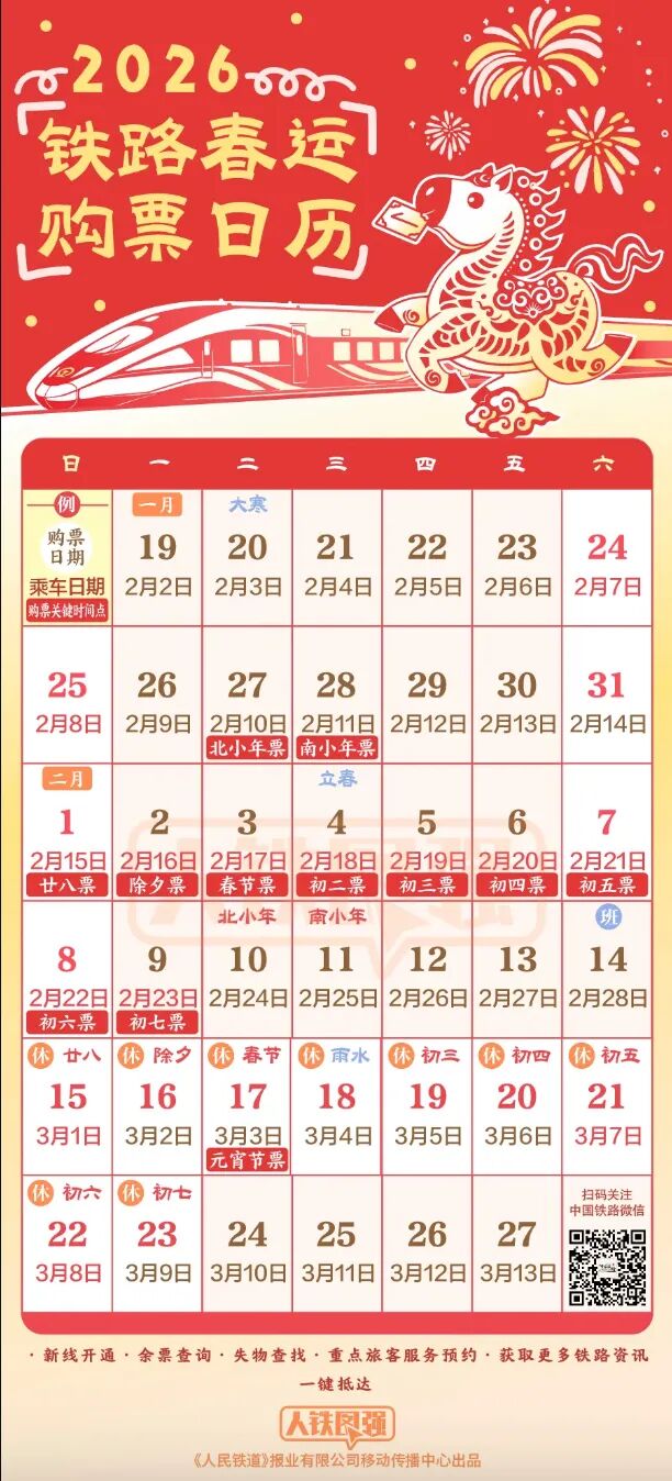 2026年铁路春运自2月2日开始,至3月13日结束,为期40天,全国铁路预计发送旅客5.39亿人次、同比增长5.0%,节前客流高峰日预计为2月13日(腊月廿六),节后客流高峰日预计为2月23日(正月初七),春运首日火车票将于1月19日开始发售。