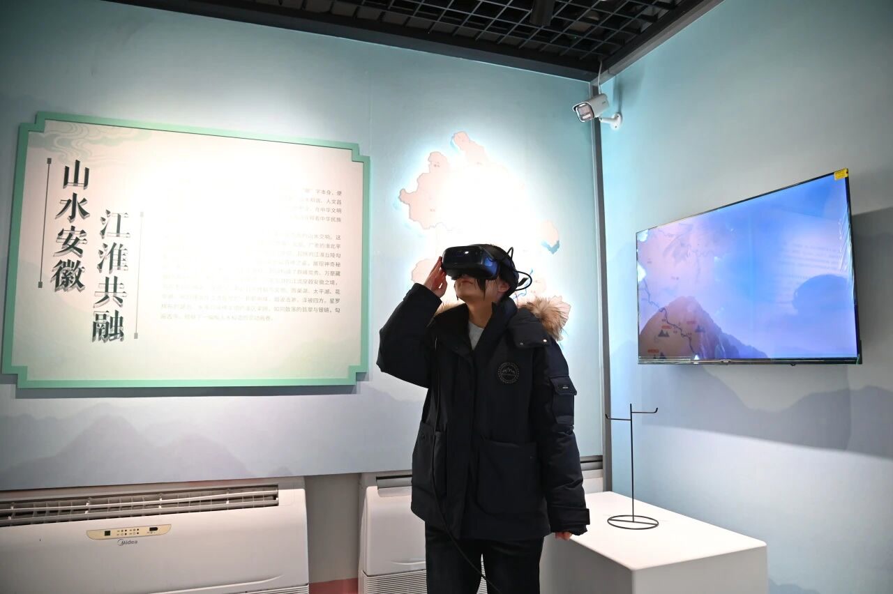 在这里,观众可以通过VR体验,领略黄山光明顶云海,感受新安江画廊竹筏漂流,风声、水声萦绕耳边,足不出京感受“皖之美,在山水”。