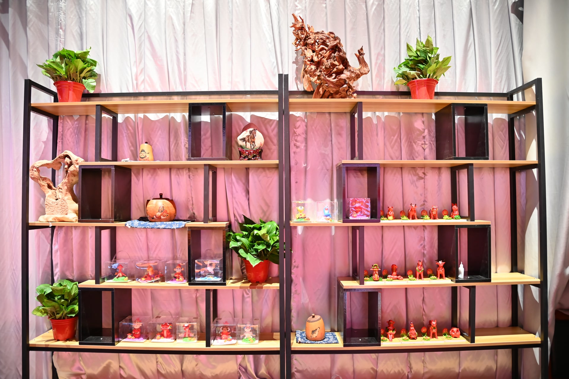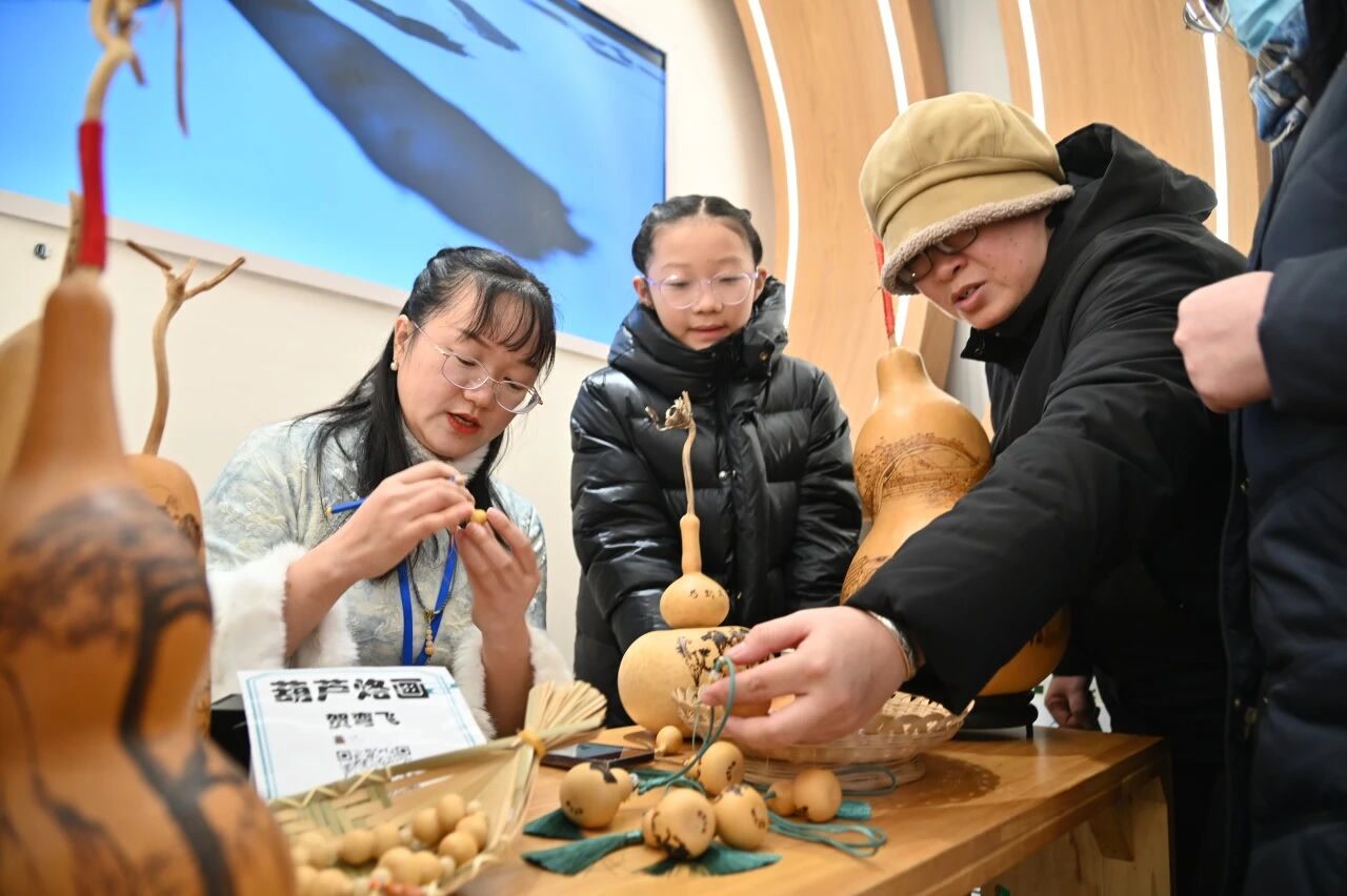 芜湖铁画、阜阳剪纸、庐州篆刻、淮北泥塑、临泉毛笔、界首彩陶等非遗项目在此展示,更有新安剪影非遗传承人胡春霞进行剪影技艺表演,安徽省美术家协会会员贺弯飞进行葫芦烙画制作展示。