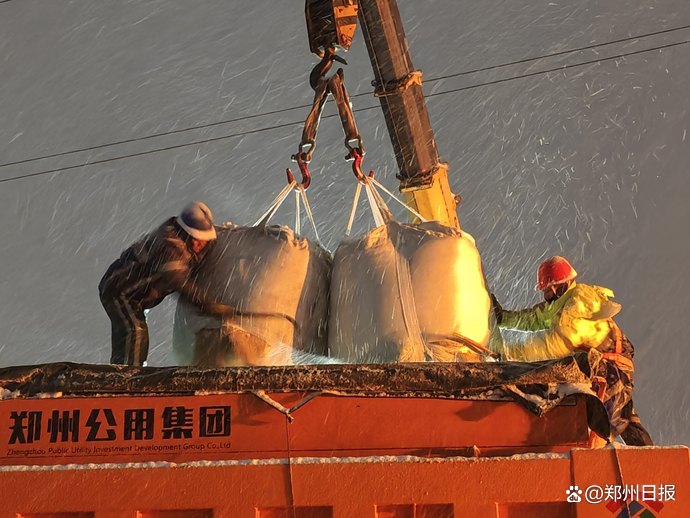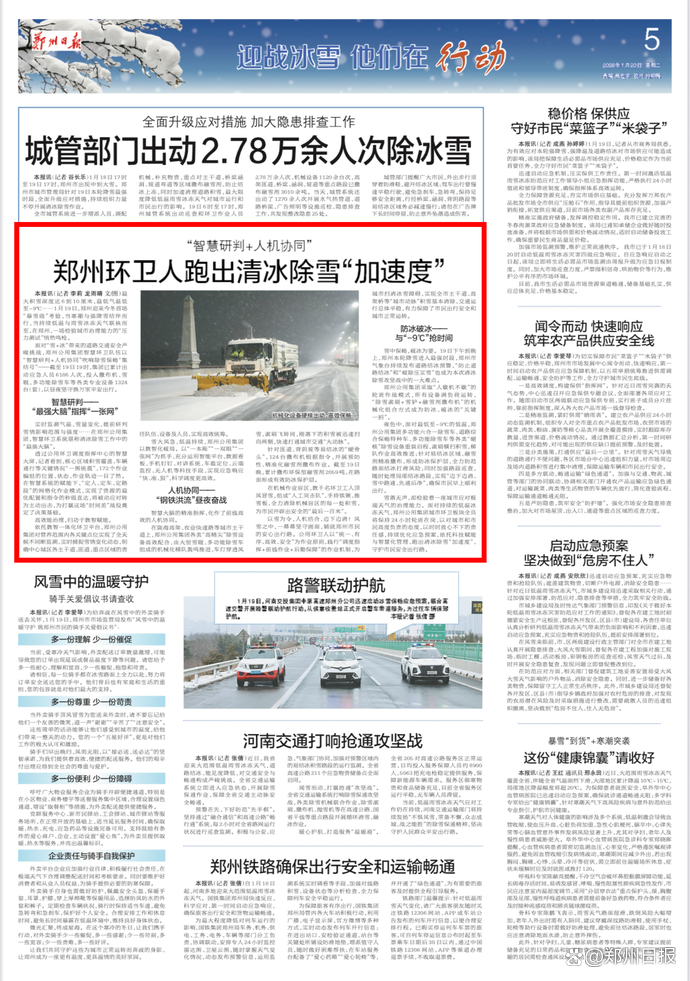郑州公用集团采取“人歇机不歇”的轮班作战模式,所有设备满负荷运转,“除雪滚刷+雪铲+融雪剂撒布机”的机械化组合方式成为防冰、破冰的“关键一招”。