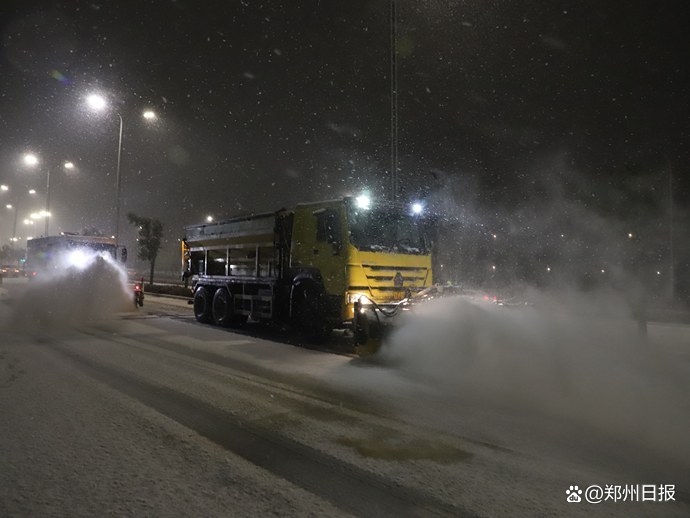 夜色中,面对最低至-9℃的低温,郑州公用集团多功能六合一除雪车、道路综合保畅特种车、多功能除雪车等各类“硬核”除雪设备重装启程,滚刷横扫积雪,梯队作业高效推进;针对易结冰区域,融雪剂精准撒布,形成防冰保护层,全力防范路面结冰打滑风险;同时加强路段巡查,随时处理局部结冰路段,实现“边下边清、雪中路通、先通后净”,确保市民早上顺利出行。