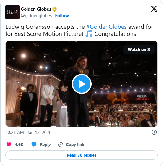 值得注意的是,这一问题并非金球奖独有。1月4日,戈兰松凭借同一作品《罪人》斩获评论家选择奖(Critics' Choice Awards)最佳原创配乐奖,该奖项的颁奖环节同样未进行电视直播。不过评论家选择奖共有约18个奖项未纳入直播环节,而金球奖仅最佳原创配乐奖遭此处理。