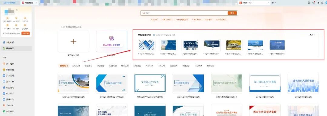 ②点击【北京科技大学WPS使用手册】,进入北京科技大学WPS,点击新建PPT-学校模板空间,即可获取精选作品模板。