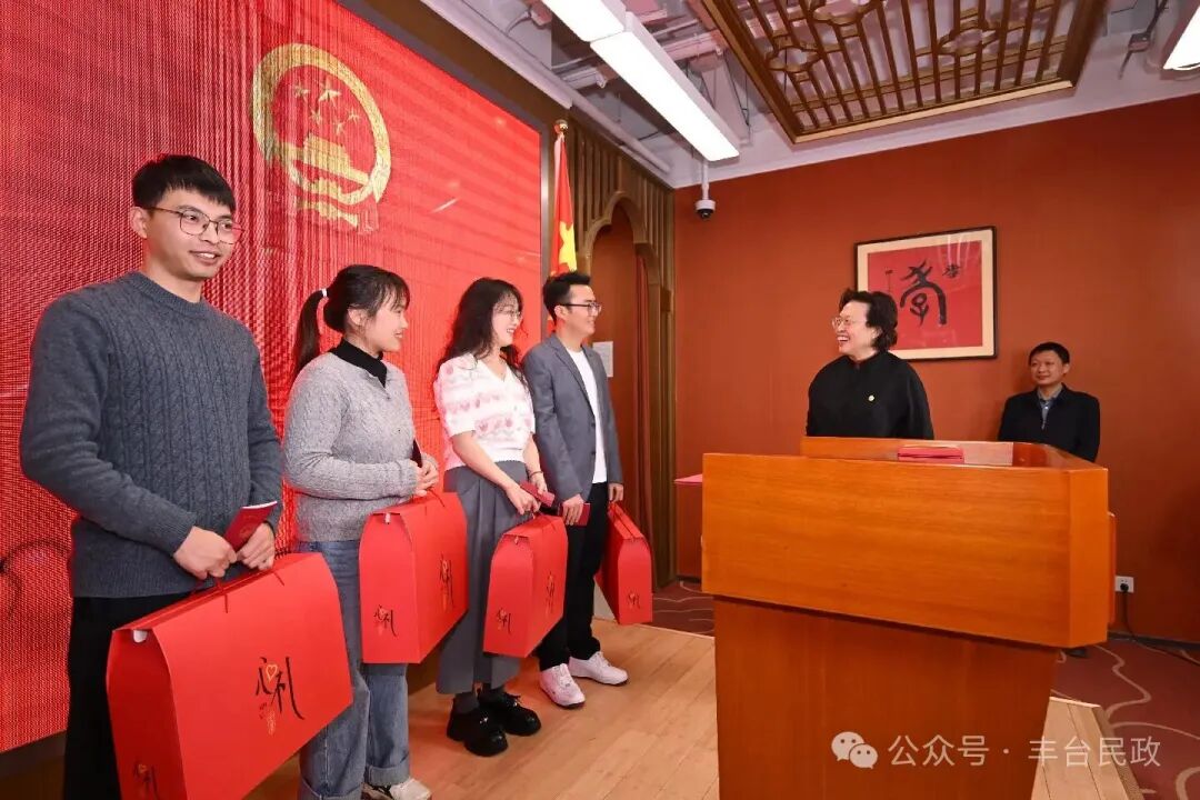 丰台区婚姻登记事务中心“情笺执礼团”颁证团队颁证员王颖莹为两对新人举行了集体颁证仪式,黄晓薇副主席作为特约颁证员,为新人颁发结婚证书,并送上真挚祝福,勉励他们践行新型婚育文化,弘扬家庭文明新风,以“小家”之美为“大家”添彩,共创中国式现代化美好未来。