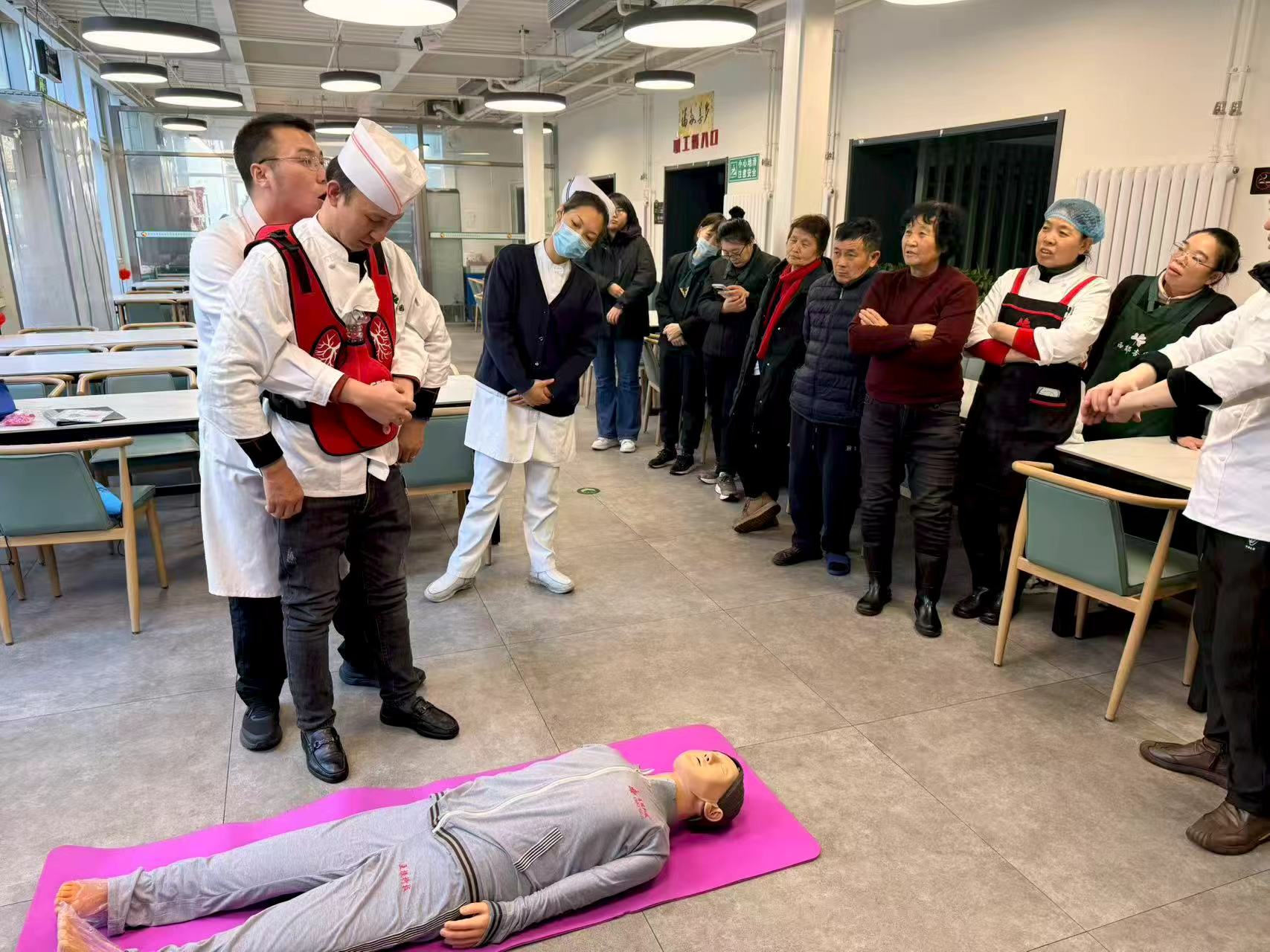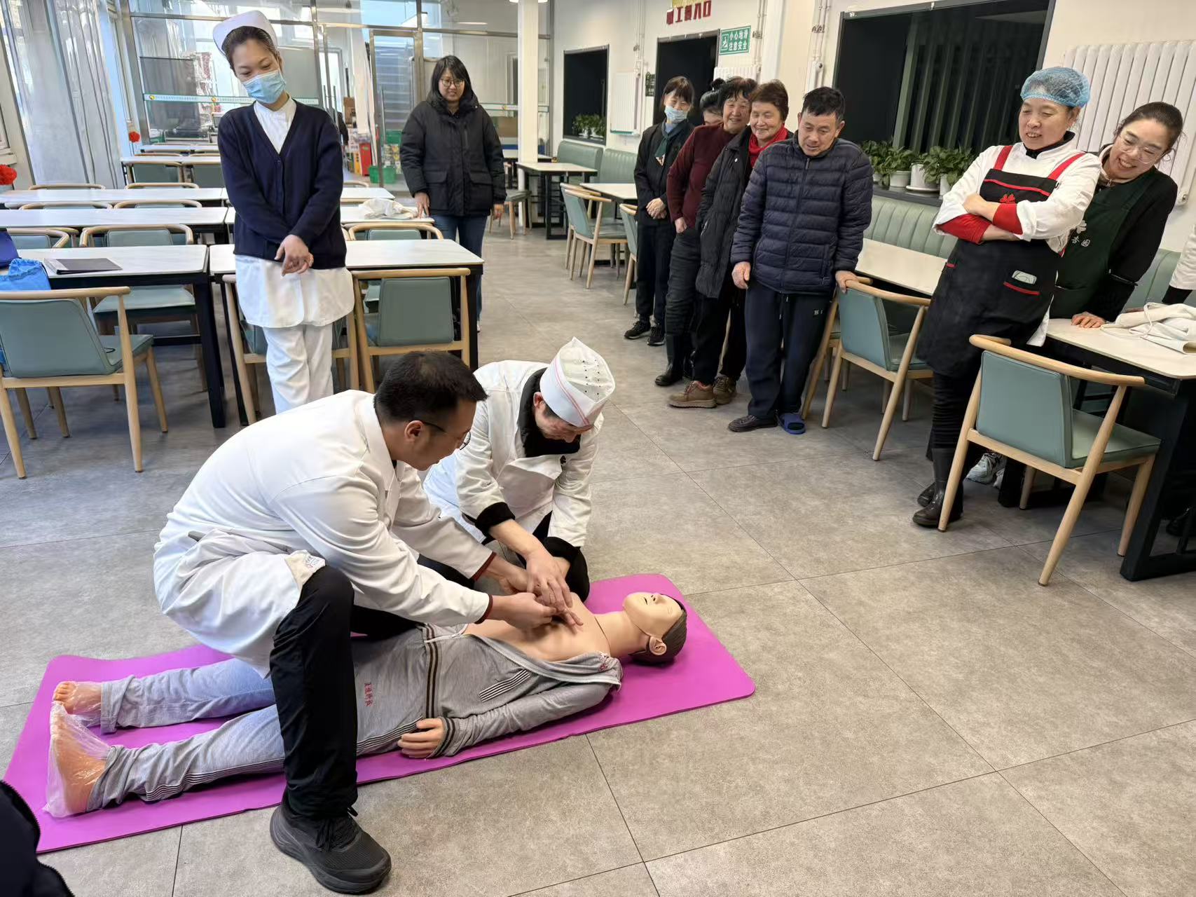 培训现场,医生一边介绍心肺复苏的操作流程和注意事项,一边用模拟人进行教学演示。餐厅工作人员围在一旁,仔细观摩每一个施救手法,不时针对细节踊跃提问,在互动中深化对急救步骤的理解与记忆。同时,针对老年人就餐时可能发生的噎食风险,医生还重点讲解了海姆立克急救法的适用场景和操作要领。在餐厅工作人员的配合下,医生详细演示了急救操作的关键步骤和动作要领,强调在老年人突发心脏骤停、气道梗阻等紧急情况下,黄金抢救时间及正确施救方法的重要性。