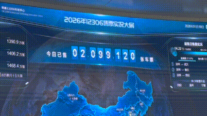1月19日,2026年春运火车票起售。在铁路12306监控中心现场大屏幕上,全国火车票的售票数据正在实时刷新。