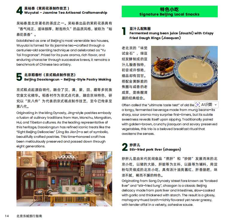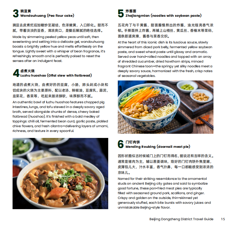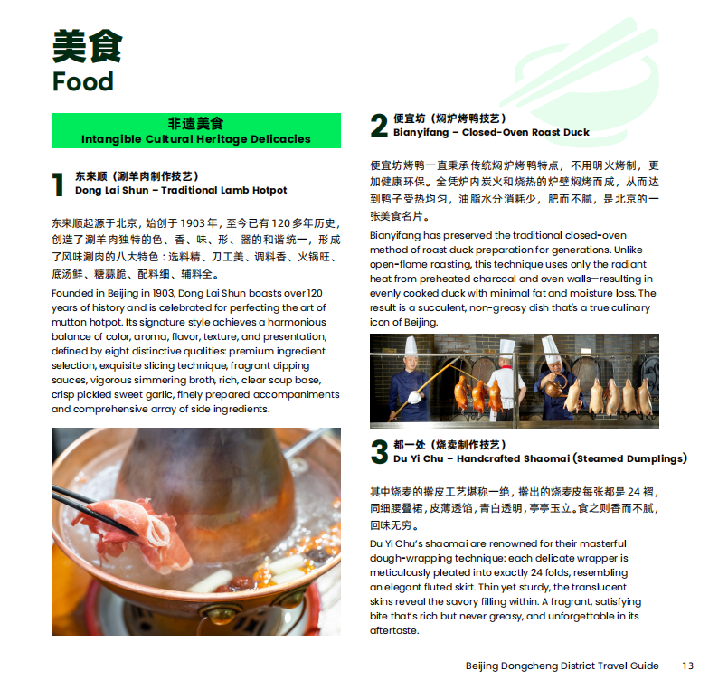 Midday in Dongcheng pulses with vibrant street life. The aroma of heritage dishes wafts from century-old eateries on Wangfujing Street, while lively calls from vendors fill Qianmen Street. Taste intangible cultural heritage cuisine and savor the time-honored flavors of Beijing’s legendary eateries.