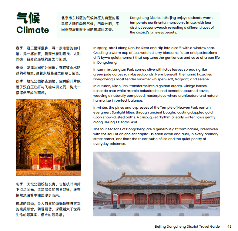 Beijing's Dongcheng district enjoys four distinct seasons, each with its own unique charm, where natural beauty and the cultural heritage of the ancient capital exist in perfect harmony. In spring, stroll along Sanlihe River and slip into a café with a window seat. Cradling a warm cup of tea, watch cherry blossoms flutter and pedestrians drift by—a quiet moment that captures the gentleness and ease of urban life in Dongcheng. In summer, Longtan Park comes alive with lotus leaves spreading like green jade across rain-kissed ponds. Here, beneath the humid haze, lies Dongcheng’s most tender summer whisper—soft, fragrant, and serene.In autumn, Ditan Park transforms into a golden dream. Ginkgo leaves cascade onto white marble balustrades and beneath upturned eaves, weaving a naturally composed masterpiece where architecture and nature harmonize in perfect balance.In winter, the pines and cypresses of the Temple of Heaven Park remain evergreen. Sunlight filters through ancient boughs, casting dappled gold upon snow-dusted paths. A crisp, quiet rhythm of early winter flows gently along Beijing’s Central Axis. In each dawn and dusk, in every ordinary street corner, one finds the truest pulse of life and the quiet poetry of everyday existence in Dongcheng.
