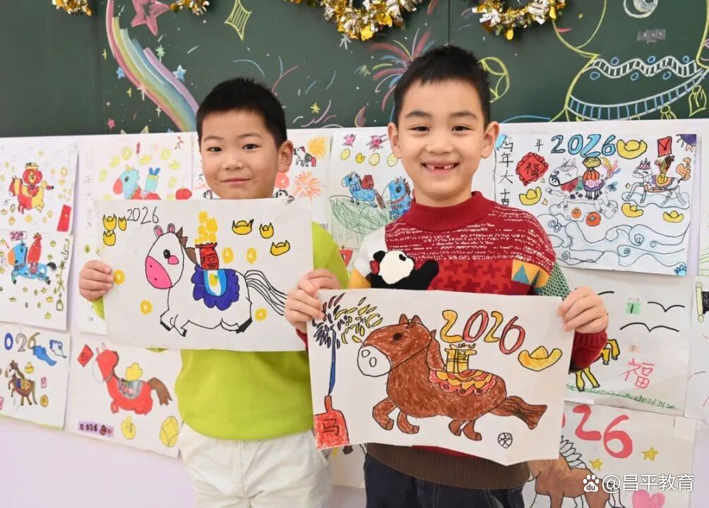 黄城根小学昌平学校通过趣味绘画的形式,锻炼学生观察与造型能力。学生们聚焦马的外形特点,用线条勾勒出马的头、躯干、四肢、尾巴等关键部位,并结合自身想象,为画作搭配色彩与花纹,展现出丰富的创造力。