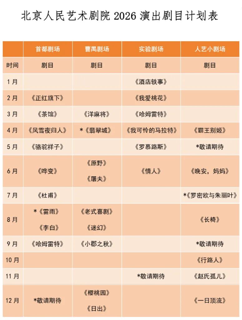 2026年,北京人艺的五座剧场将继续敞开大门,共同为观众呈现多元并存、层次丰富的演出格局。首都剧场、曹禺剧场、实验剧场及人艺小剧场将依据各自鲜明的定位,奉献风格多样的舞台艺术精品。经典剧目与原创作品并重,守正与创新并行,写实与写意交织,满足不同观众群体的多样化审美需求。