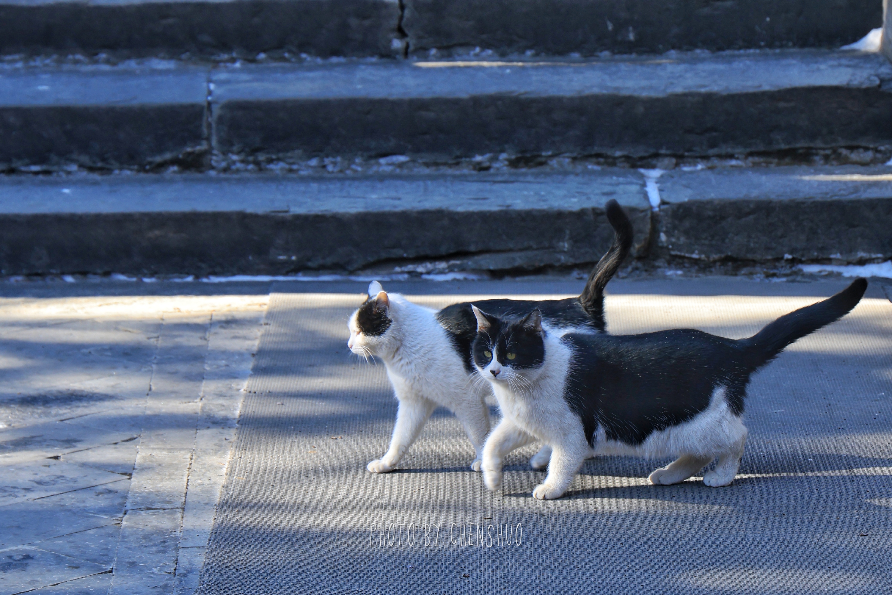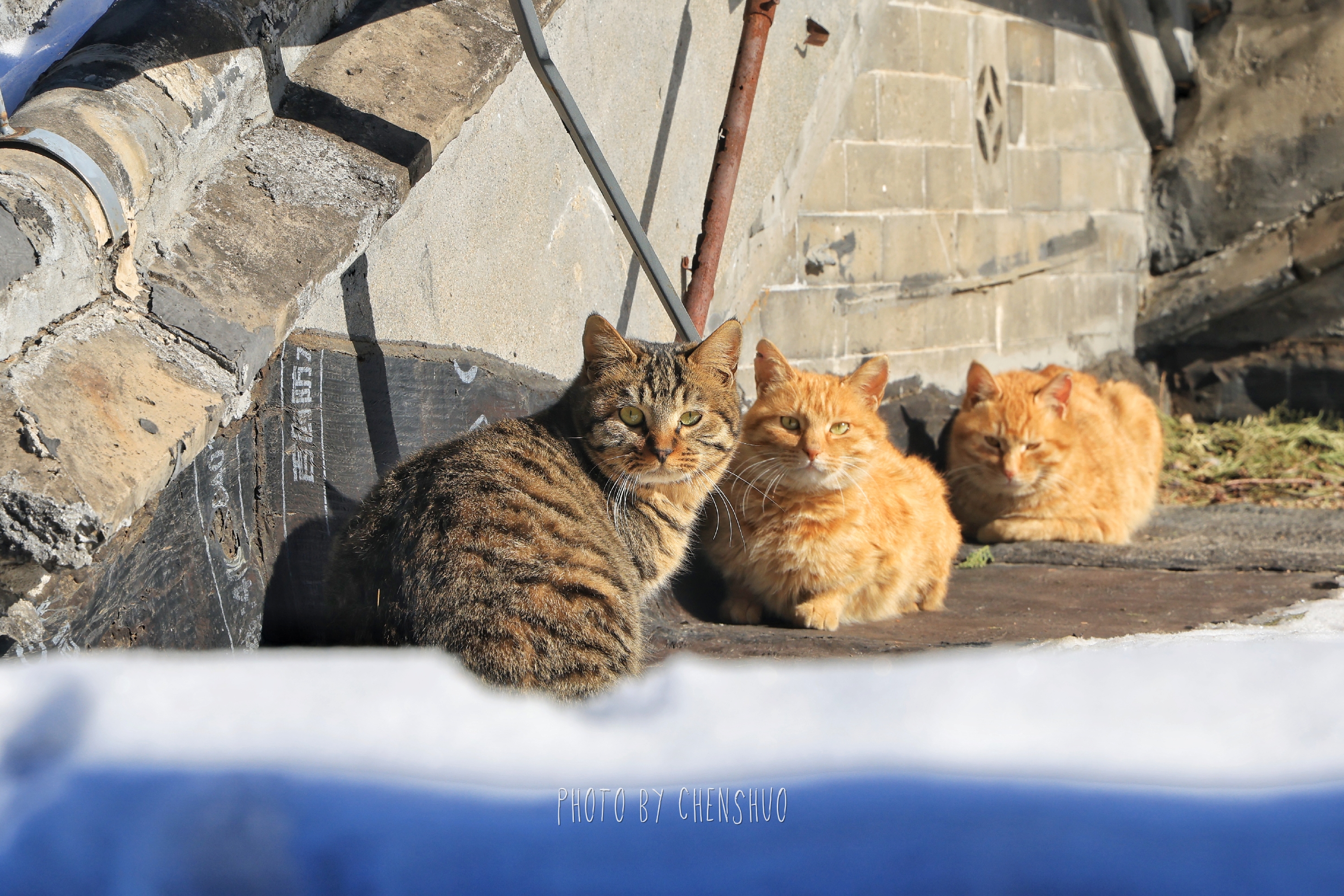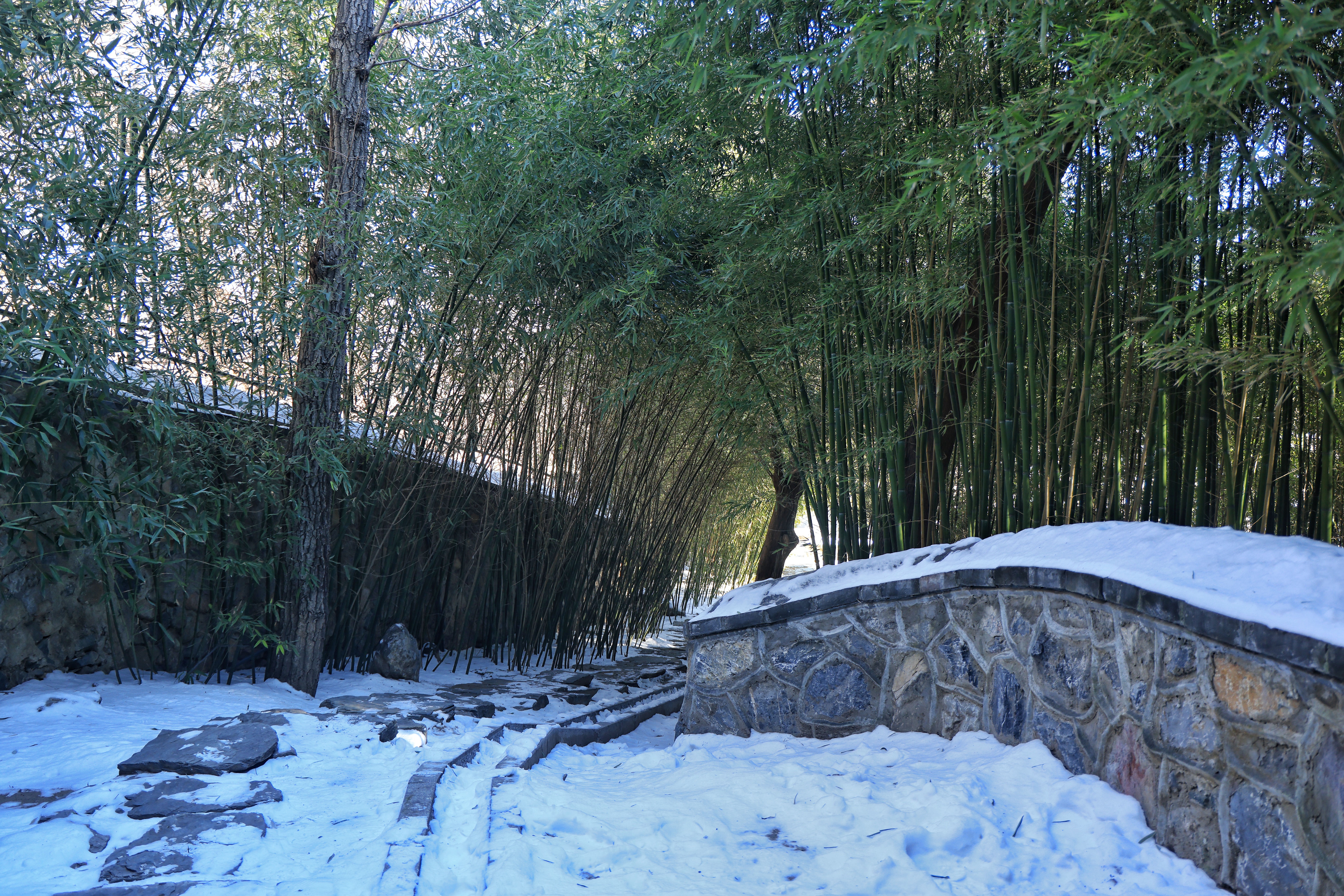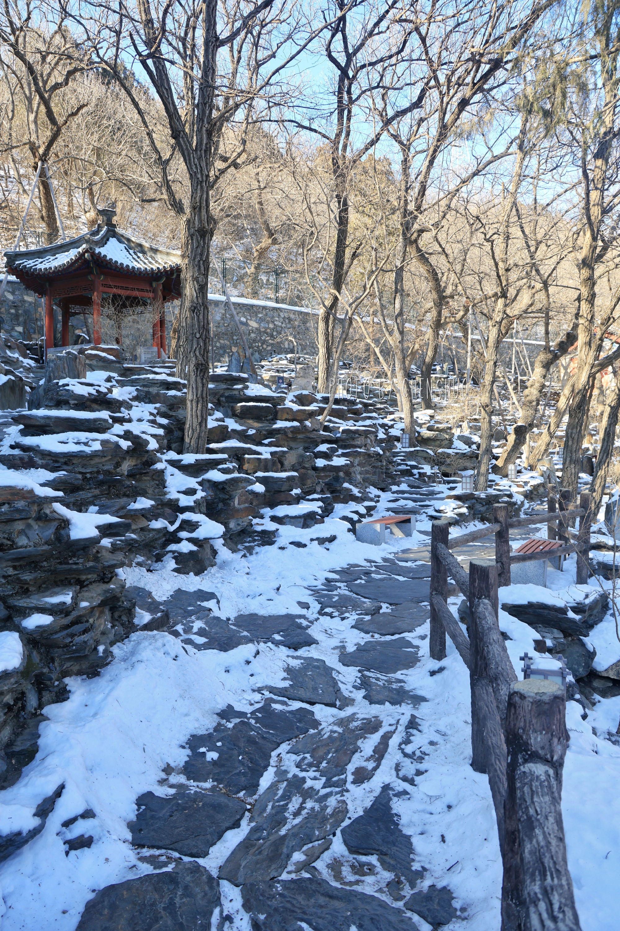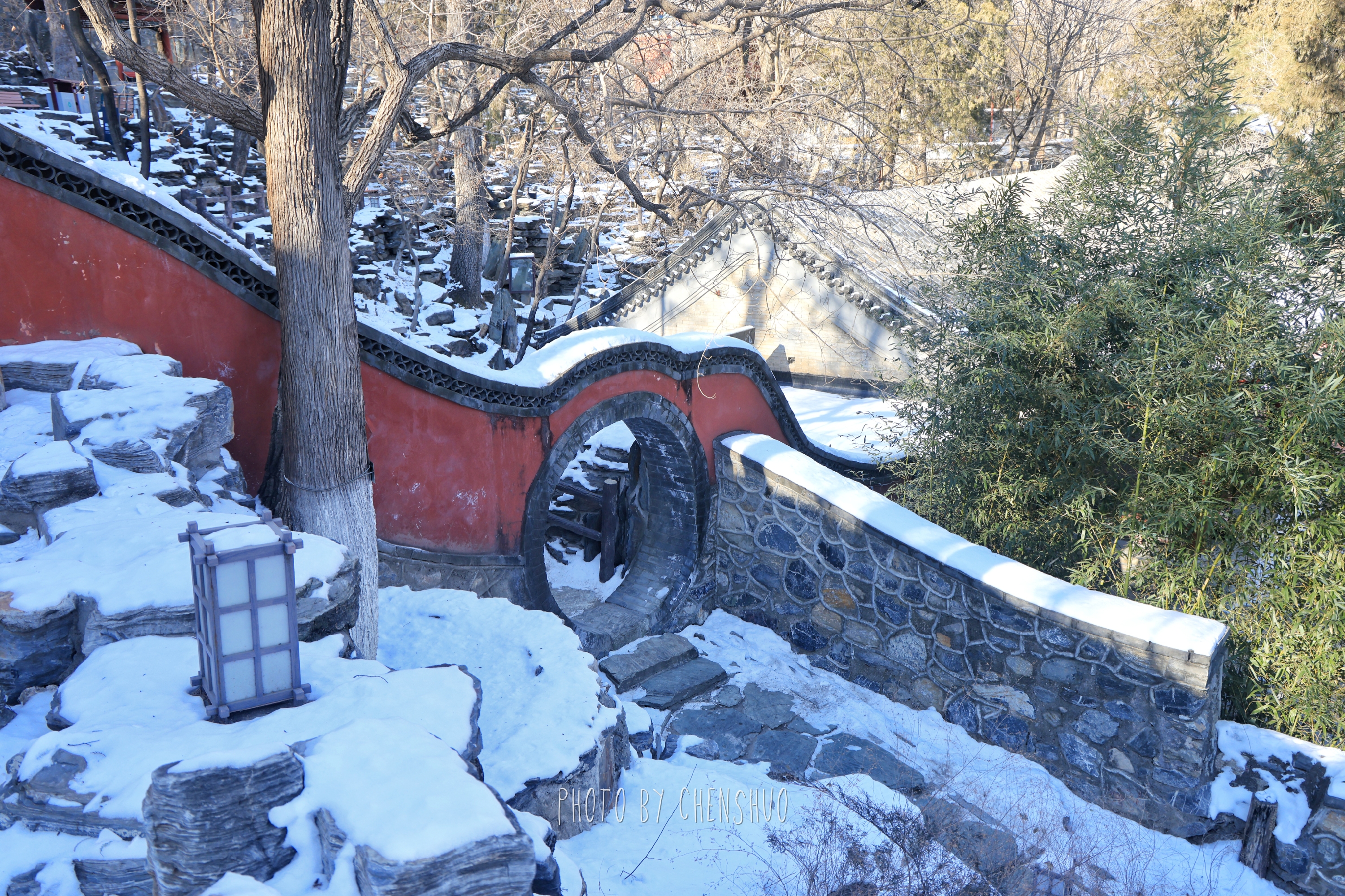 堆叠的假山石上覆着雪,像一幅留白的水墨画;石径旁的竹林依然翠绿,雪挂在竹叶尖,风一吹便簌簌落下。拐过竹林,墙角的三只猫正团成一团晒太阳——一只虎斑猫警觉地抬眼,两只橘猫则瘫在石阶上,任阳光把绒毛晒得暖烘烘的。它们是大觉寺的“常住民”,比游客更懂这里的四季。