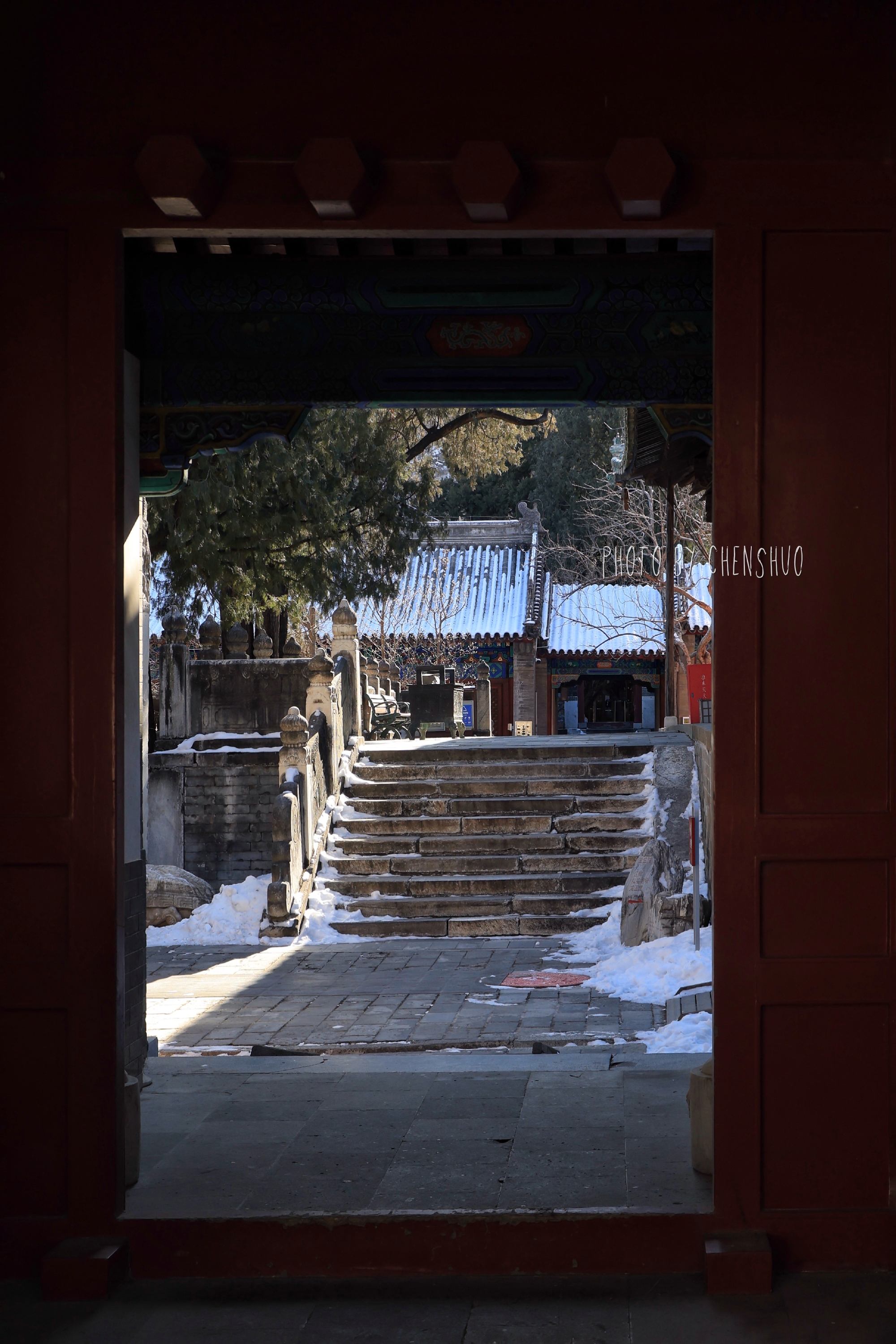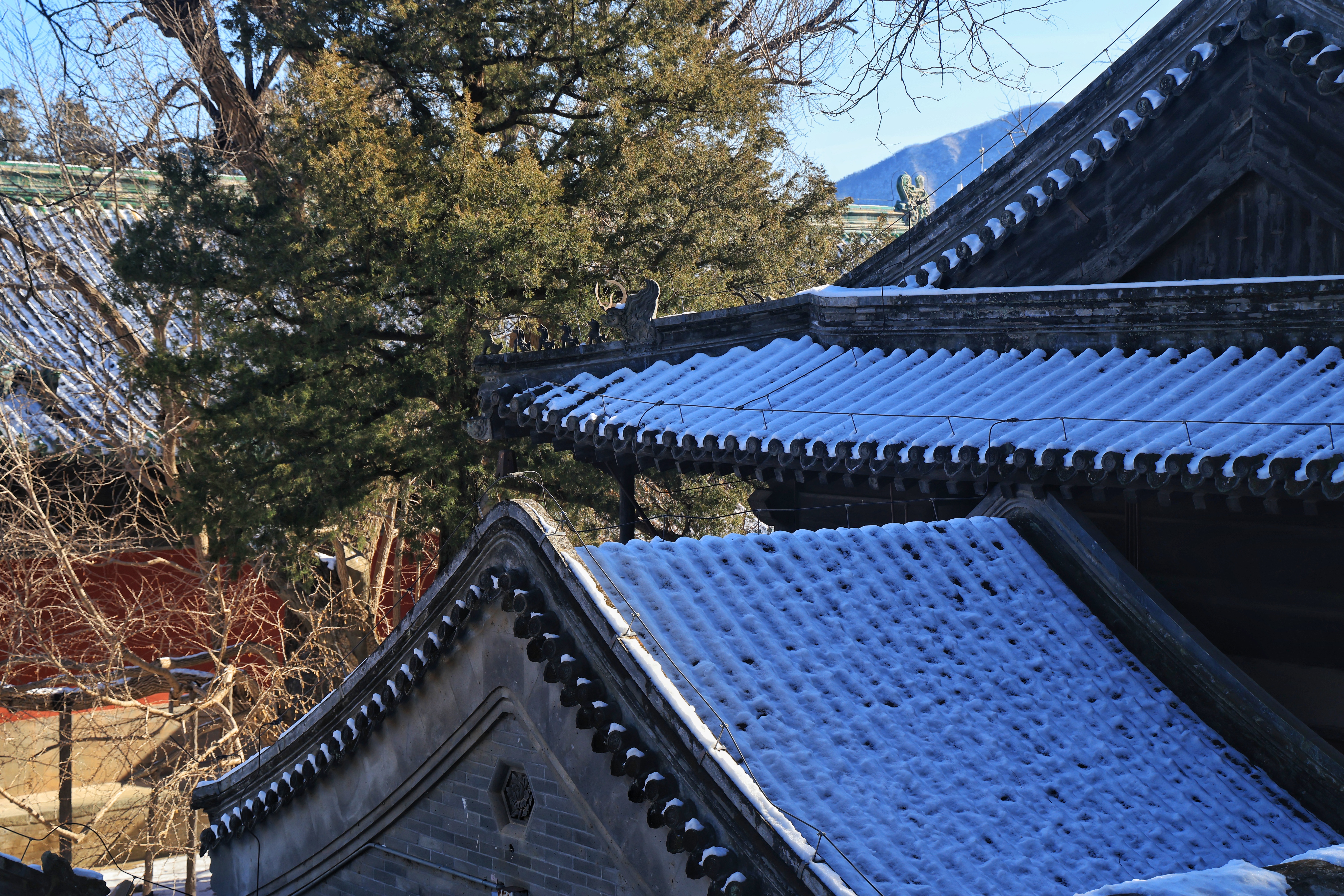 雪粒落在黛瓦上,积出薄薄一层白,与檐角的彩绘斗拱相映成趣。脚下的青石板路还留着未化的残雪,踩上去咯吱作响,是独属于冬日的伴奏。