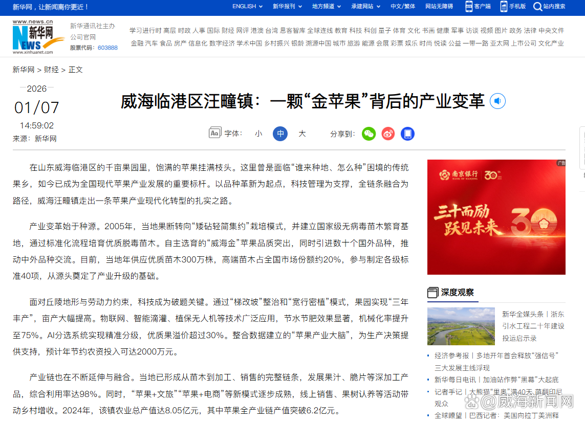 1月7日,《新华网》刊发《威海临港区汪疃镇:一颗“金苹果”背后的产业变革》一文,报道汪疃镇以品种革新为起点,科技管理为支撑,全链条融合为路径,走出一条苹果产业现代化转型的扎实之路。以下为报道全文: