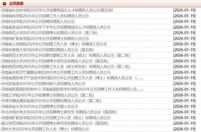 1月19日,河南省人力资源和社会保障厅事业单位人事管理处发布22条拟聘用人员公示信息,其中包括十余所高校拟聘用人员公示信息。有网友发现,该批次公示的拟聘用人员绝大多数为博士研究生。