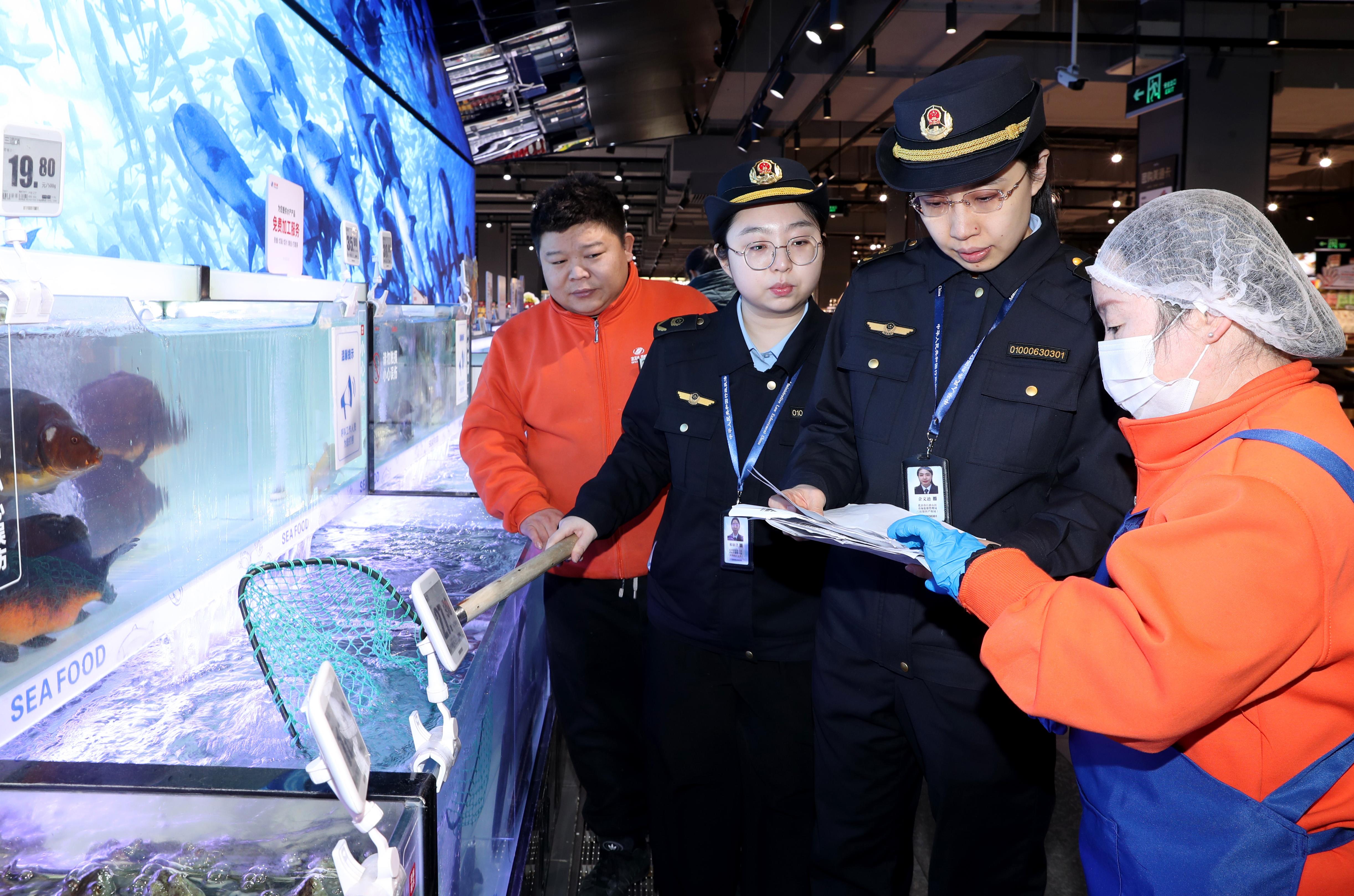 1月19日,北京市石景山区市场监管局开展水产品专项检查行动。执法人员核查商家进货凭证、产品检疫证明等并开展抽样检测,保障产品质量安全,防止来源不明的产品进入市场。
