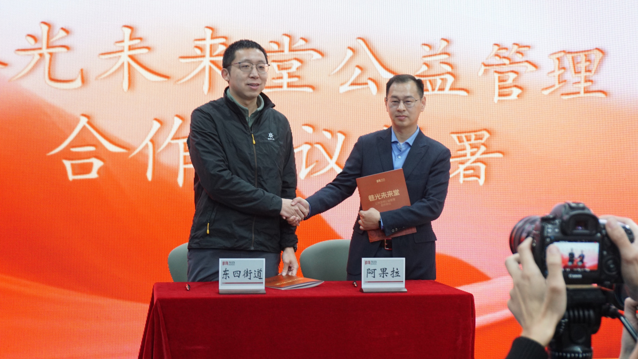 为深化党建引领基层治理,打造“共治共建共享”社会治理新格局,街道工委副书记、办事处主任贾峥和“巷光未来堂”主理人、阿果拉咨询管理有限公司总经理宣铁卫共同签署公共空间公益管理合作协议,发布《巷光未来堂公益管理办法》。随后,发起2026年东四街道“家庭运动健康专项公益计划”,区妇联主席刘从容、空间主理人宣铁卫共同为社区书记代表、学校代表发放总价值为88000元的专项消费券。