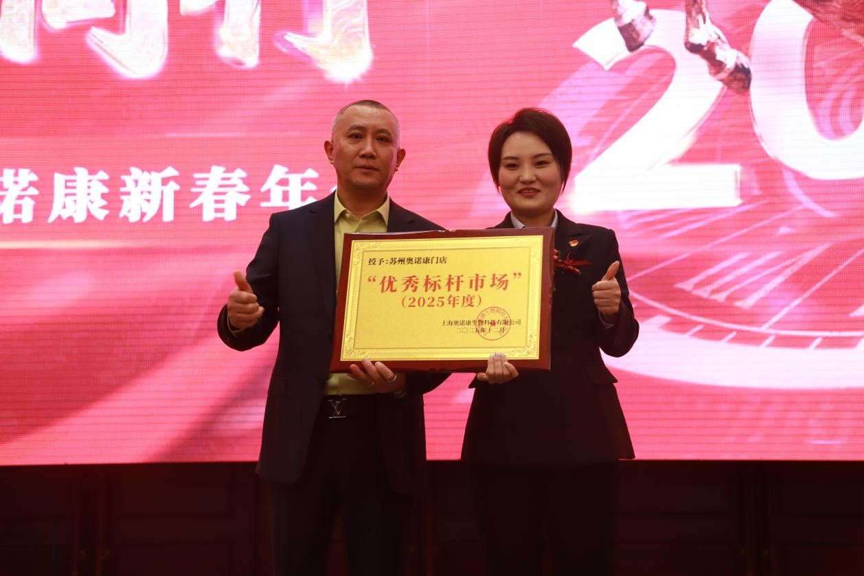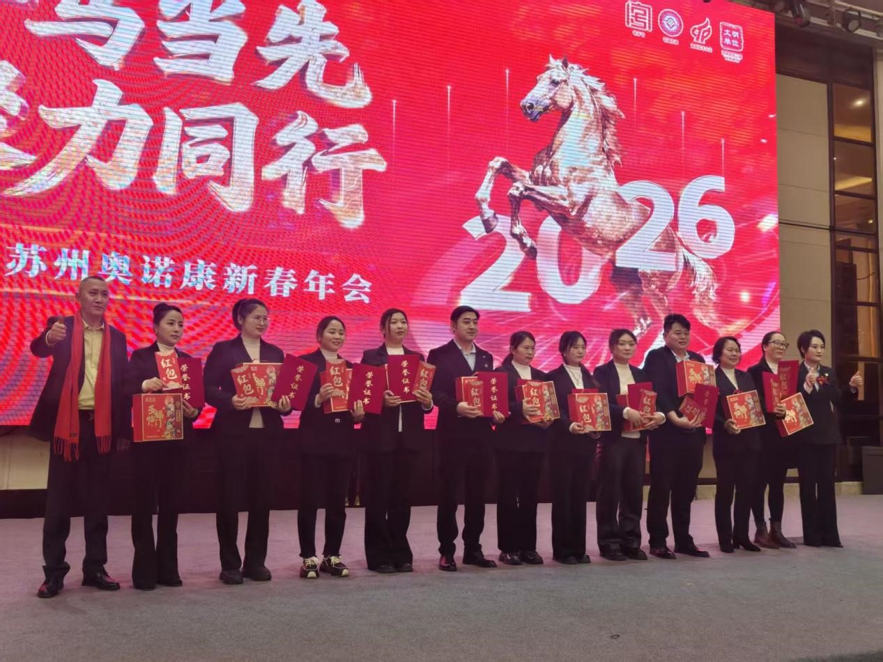 灵蛇辞旧添祥瑞,马踏新春送福来。1月16日,苏州奥诺康新春年会暨年度颁奖典礼在张家港华芳金陵国际大酒店隆重举行。千余名嘉宾欢聚一堂,共忆2025年奋斗征程,共绘2026年发展蓝图,盛况空前。活动在庄严的国歌声中拉开帷幕,《万马奔腾耀九州》等精彩节目轮番上演,手语操等环节互动热烈,充分展现了奥诺康团队的凝聚力与向心力。