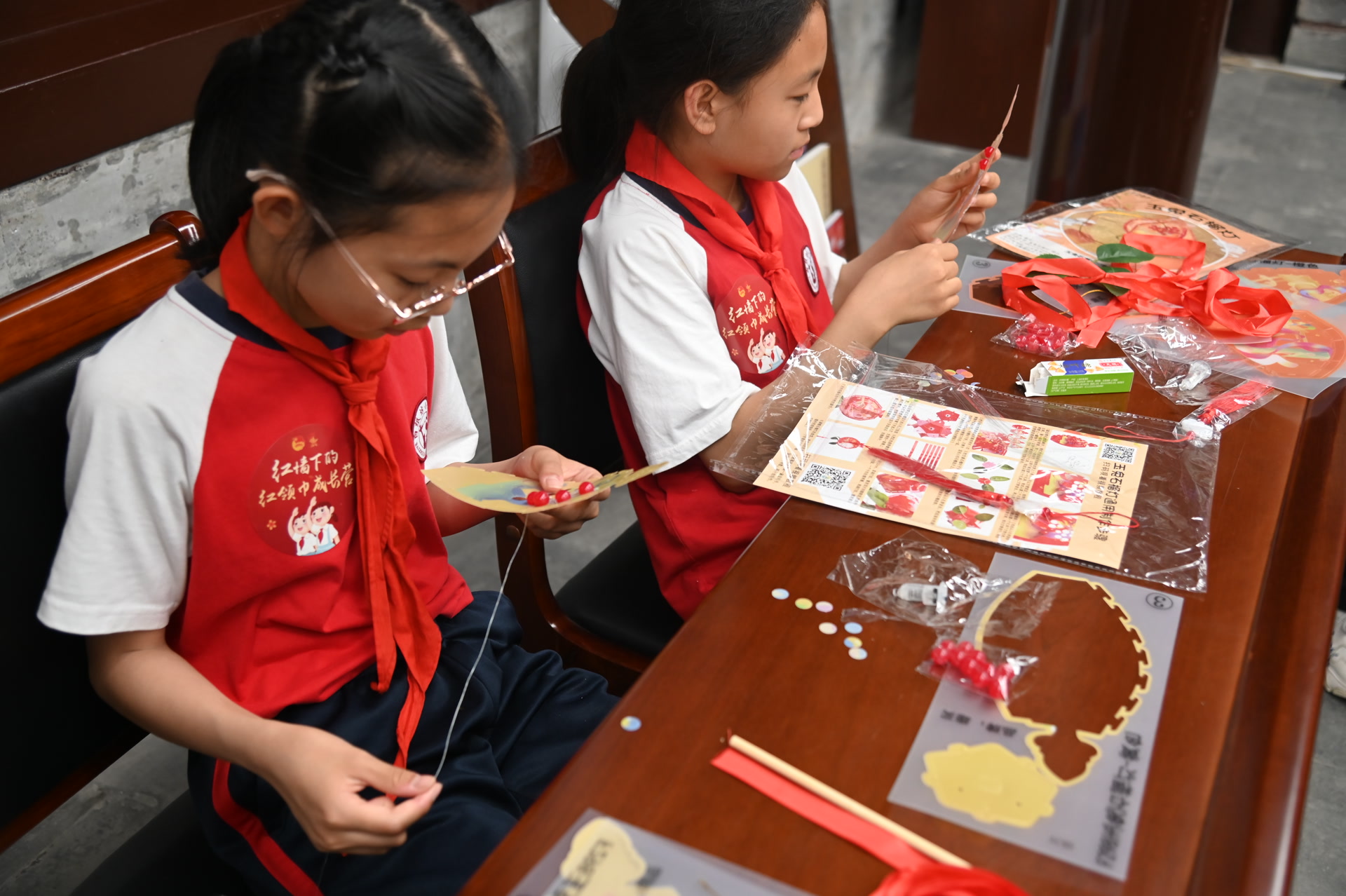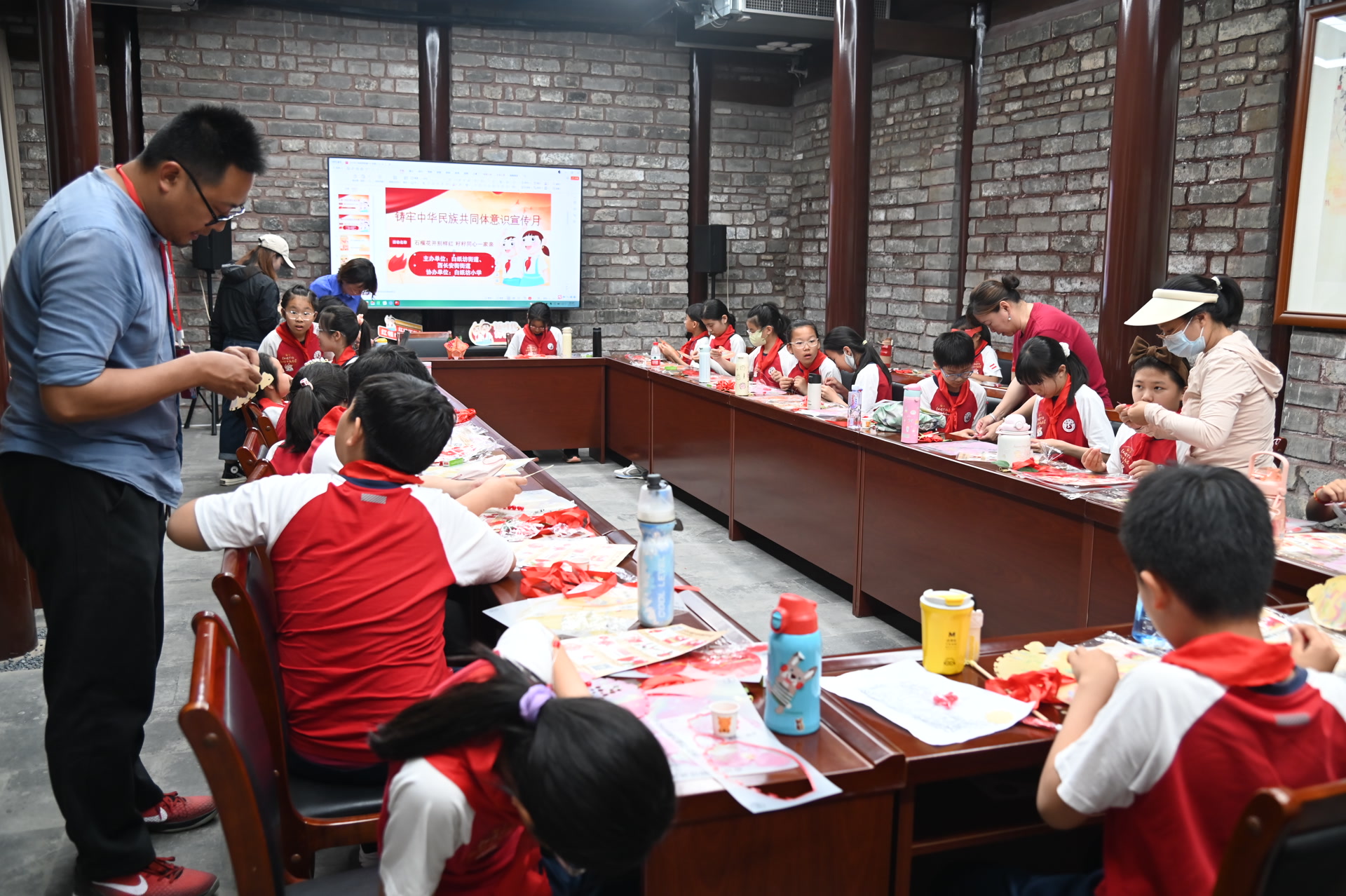 “石榴花开别样红 籽籽同心一家亲”铸牢中华民族共同体意识宣传活动举办,白纸坊小学少先队员们在蒙藏学校旧址体验石榴灯手工艺品制作。